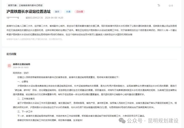 据了解,去年4月有网友通过地方领导留言板反映,对沪昆铁路长水设站位置选址作出建议。对此,曲靖市交通运输局进行了回复。