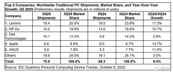 据国际数据公司(IDC)发布的《全球季度个人计算设备追踪报告》,2025年第三季度全球PC市场出货总量达到7590万台,同比增长9.4%。