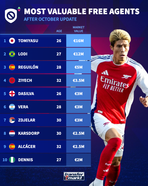 虎扑10月21日讯德国转会市场统计了自由球员身价榜单,其中,本赛季与阿森纳解约的日本后卫富安健洋以1600万欧元居首。