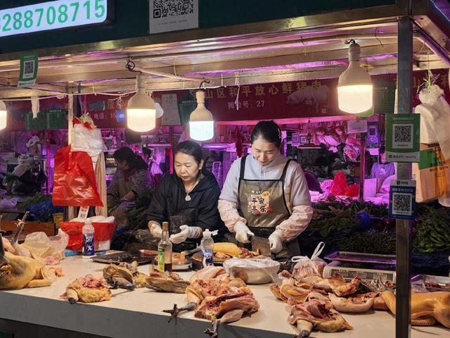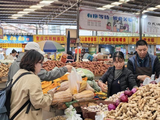 在蔬菜区,萝卜、莲藕、山药等“暖身菜”成了抢手货。“老板,给我来两根白萝卜,要炖排骨的!”市民张女士弯腰挑选着,她告诉记者,自己特意早起采购,“我家娃昨天有点咳嗽,炖点萝卜排骨汤既能暖身子,又能润润喉。”摊主刘大姐忙着称重,她的摊位前堆着小山似的萝卜,“降温后萝卜最好卖,昨天进了150斤,今天得再补100斤才行。”