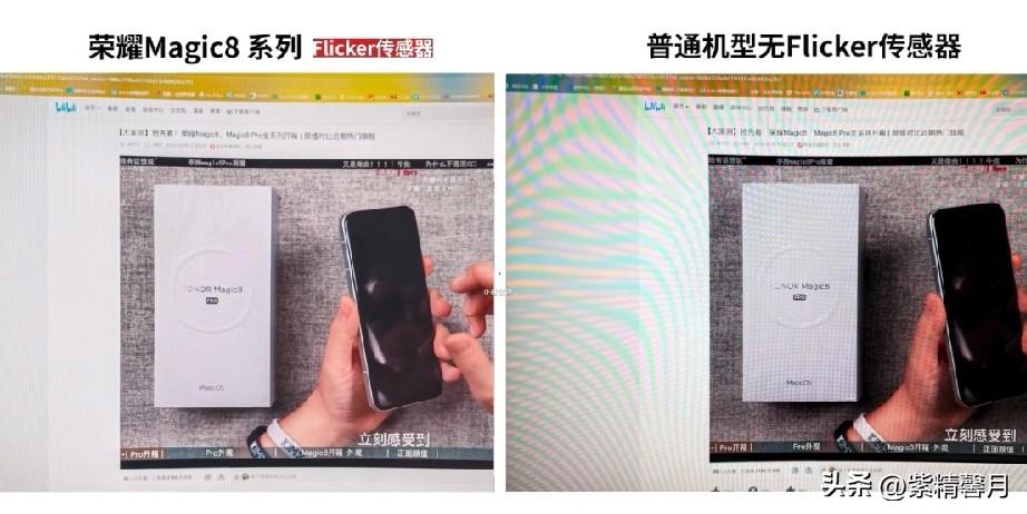 有时候真的很想骂荣耀,首发的技术这么好用却没多少人知道。 Magic8系列带来的一个黑科技技术,定制的 「Flicker传感器」,非常建议友商也跟进。 它的主要两个作用: 1、检测伤眼的灯光 平时在家里、办公室总觉得眼睛累?可能是灯光在高速闪频。荣耀Magic8首发了 「照明闪烁检测」 功能,比肩专业仪器,可以知道周围的环境光是否足够护眼,十分实用。 2、提升拍照成片率,随手拍都清晰 以前在灯光下拍照总出现条纹,拍娃拍宠物容易糊等等,现在荣耀这颗传感器能精准理解复杂光源,配合 「DOL抗闪抓拍引擎」,很多环境都能稳定成片了。