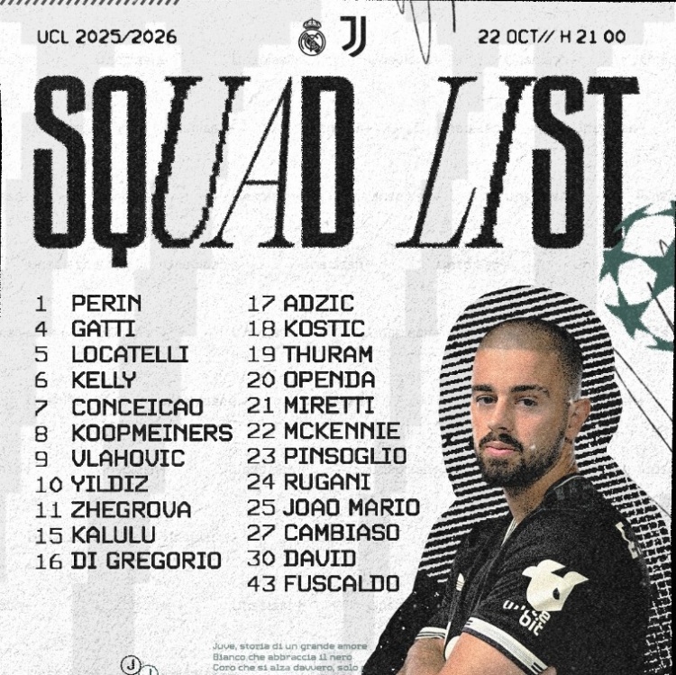直播吧10月21日讯北京时间10月24日3点,欧冠联赛阶段第三轮,尤文客战皇马,尤文公布本场比赛名单,伊尔迪兹在列,米雷蒂、热格罗瓦回归。