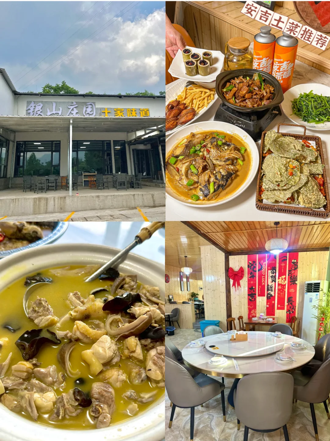 银山庄园:天荒坪深山里的农家菜头牌🥇 自养后山鸡炖的土鸡汤,金黄油花飘着山林鲜气,喝一口直接鲜到天灵盖🍗 溪水鱼现捞现煎,外酥里嫩连鱼鳞都入味!吃完沿庄园溯溪踩水,顺路打卡后山咖啡馆,望竹海喝咖啡,体验感拉满~