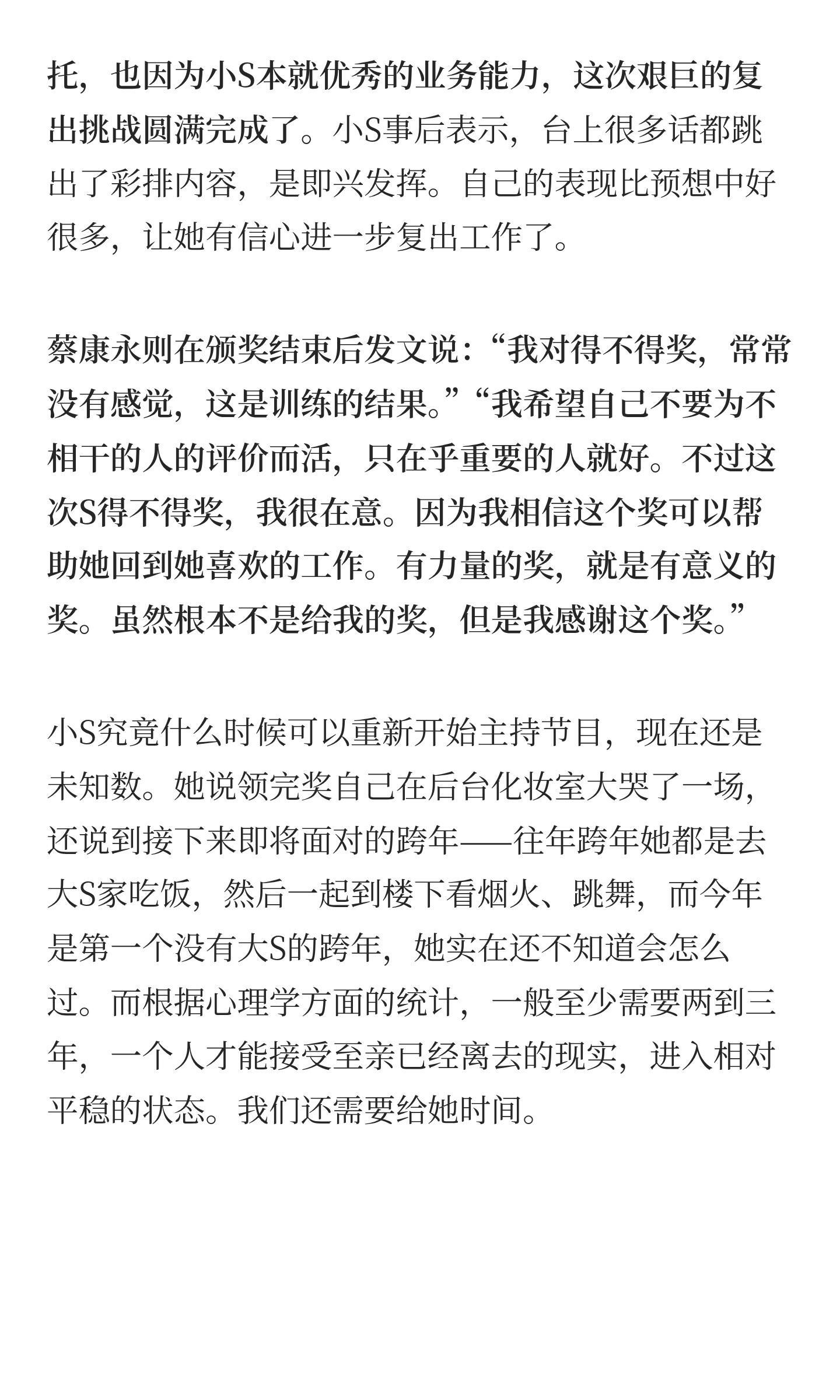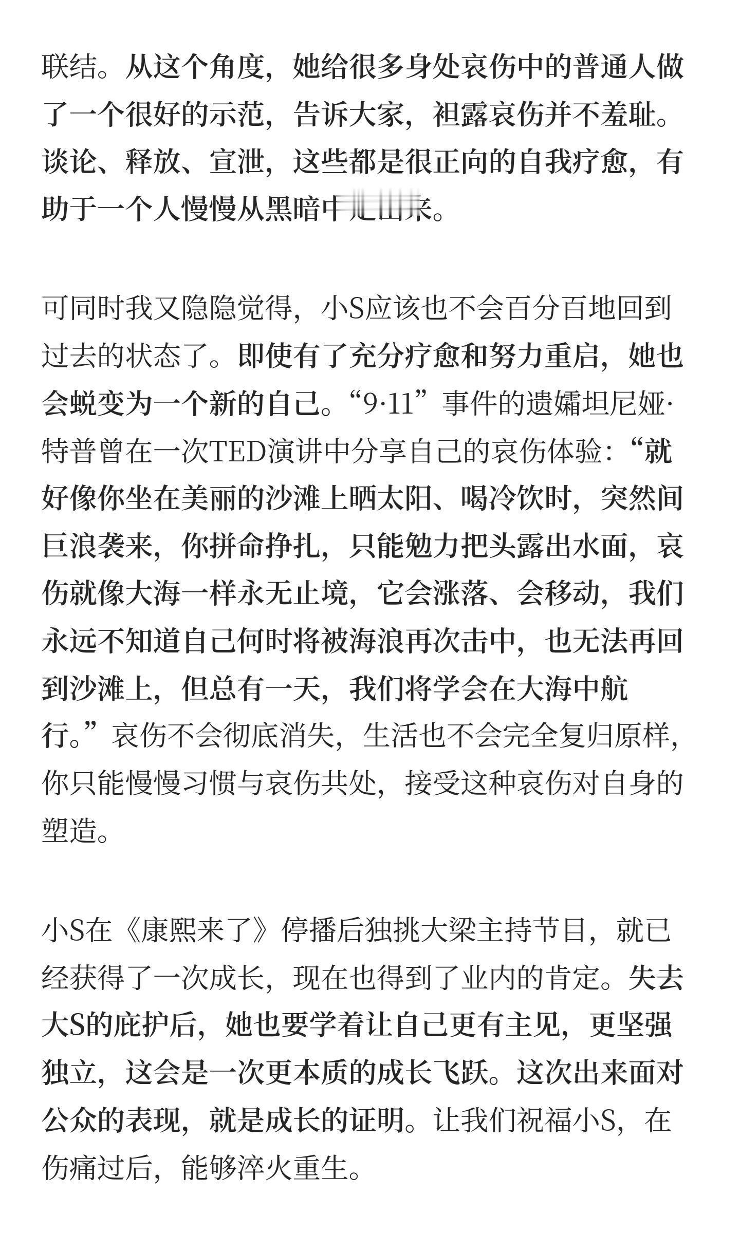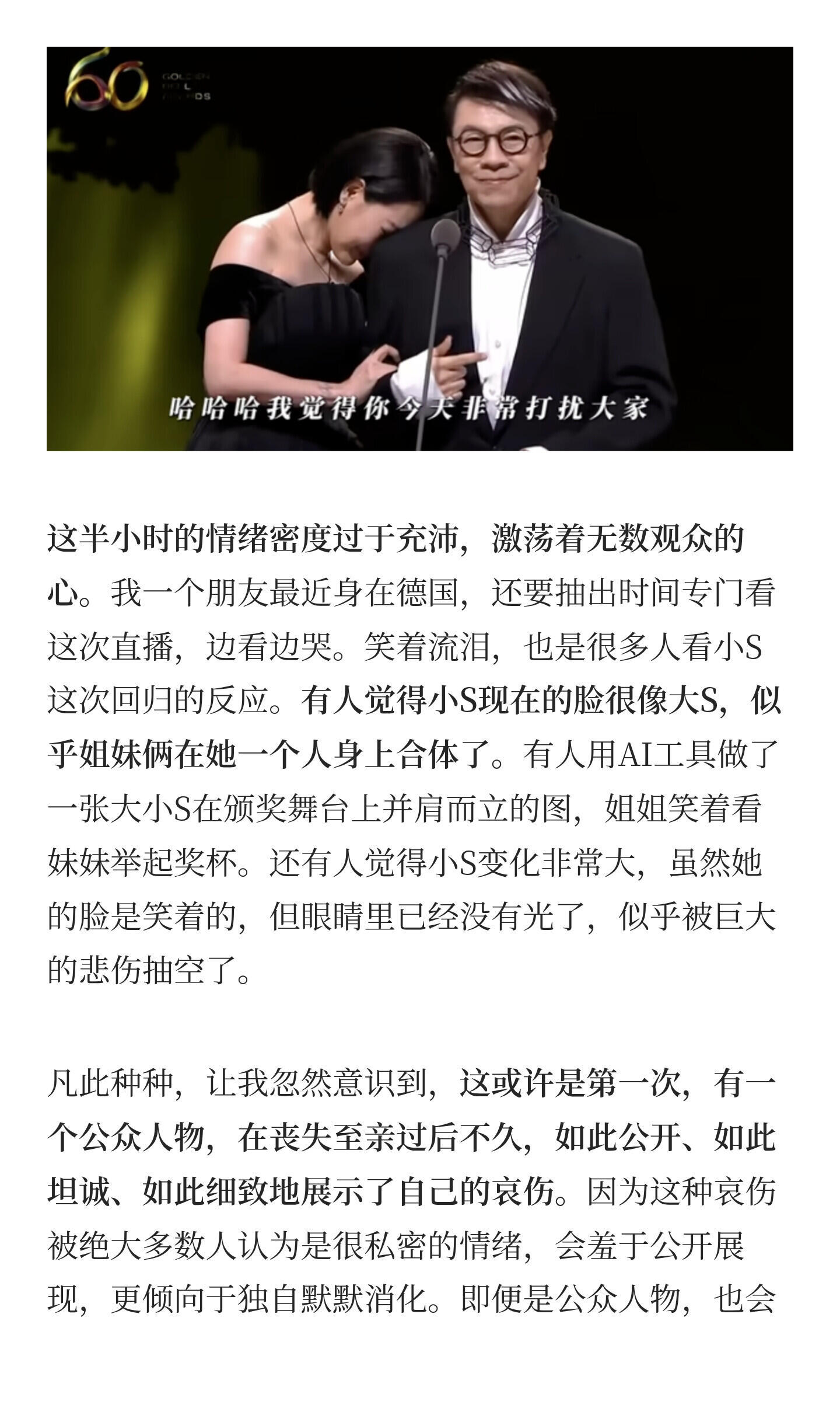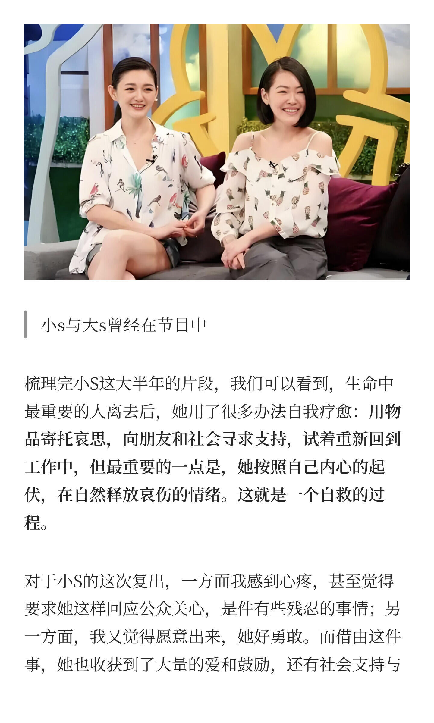 我们都能想象,失去大S会对小S是多么大的打击。这或许是第一次,有一个公众人物,在丧失至亲过后不久,如此公开、如此坦诚、如此细致地展示了自己的哀伤。