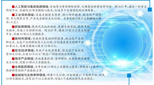 人工智能与集成电路领域。实施算力资源供给创新、大模型创新推进、智能场景牵引赋能以及电路材料提质增效、半导体制造创新突破等行动。到2027年,建成一批重点科创平台,突破约20项关键核心技术,打造多个全国领先的应用场景,构建特色产业集群协同创新生态。