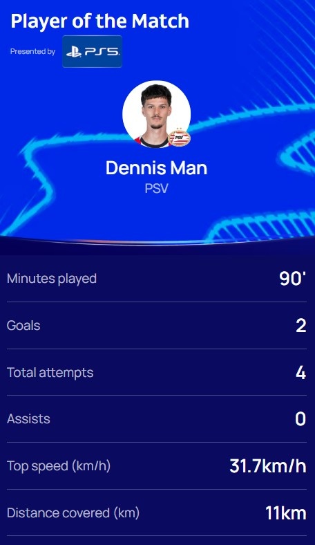 本场比赛埃因霍温球员丹尼斯-曼发挥出色,梅开二度,4次射门,跑动距离达到11km,赛后他也当选欧冠官方评选出的本场最佳球员。