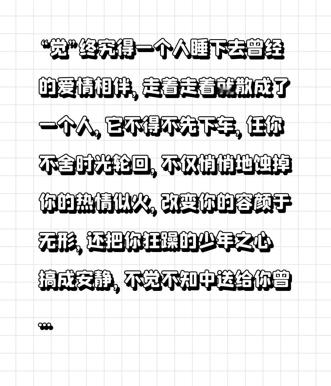 “觉”终究得一个人睡下去 曾经的爱情相伴,走着走着就散成了一个人,它不得不先下车,任你不舍 时光轮回,不仅悄悄地蚀掉你的热情似火,改变你的容颜于无形,还把你狂躁的少年之心搞成安静,不觉不知中送给你曾经憧憬的未来 你睁眼一看,哪里是未来,分明是从前一直跟踪的恐惧,不过以前的你在前面躲避它,现在的你被它在身后追,未来已经移形于身后 而你又将孑然一身的面对 但你不怕它了,你明白了这就是本来的模样 智能配图