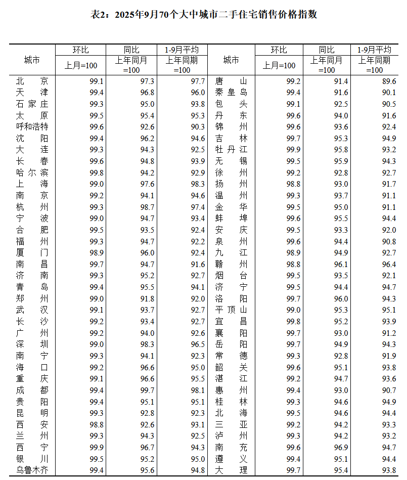 二手住宅价格方面,国家统计局数据显示,9月份同、环比均无城市上涨,也是年内首次出现“全跌”局面。