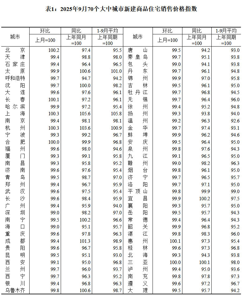 国家统计局近日发布的《70个大中城市商品住宅销售价格变动情况》显示,房价延续调整态势。9月70个大中城市中,各线城市商品住宅销售价格环比下降,同比降幅继续呈收窄态势。