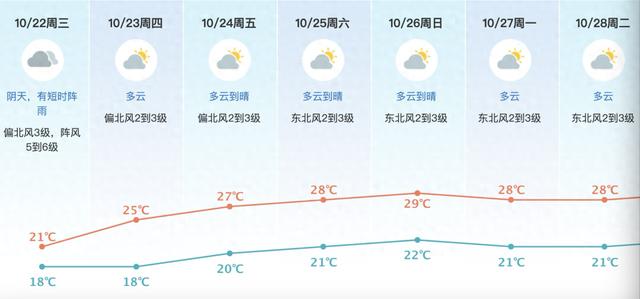 10月22日,南部沿海市县多云到阴天,有分散小雨,其余市县多云,局部有零星小雨。最低气温:粤北、肇庆北部、云浮西北部市县12~15℃,南部沿海市县18~21℃,其余市县15~18℃。
