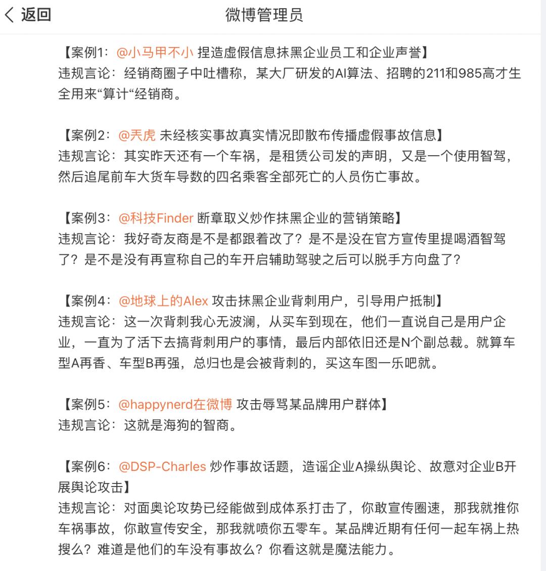 微博管理员10月20日晚间发布消息称,近期,在落实网信办“清朗·优化营商网络环境”专项行动中,针对恶意抹黑诋毁企业、散布涉企虚假信息、集纳企业负面、引导并煽动用户攻击企业等行为进行重点打击,并责令对存在相关违规行为的多名汽车领域KOL(意见领袖)用户予以禁言90天、禁止广告收益180天的处置。