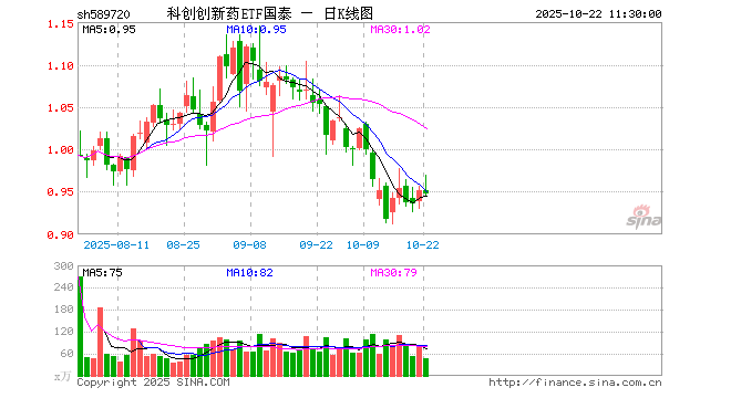 10月22日,截止午间收盘,科创创新药ETF国泰(589720)跌0.32%,报0.948元,成交额4595.86万元。科创创新药ETF国泰(589720)重仓股方面,博瑞医药截止午盘涨1.47%,百济神州跌1.07%,百利天恒跌1.52%,泽璟制药涨0.30%,艾力斯涨1.77%,君实生物跌0.44%,益方生物涨0.21%,神州细胞涨0.13%,特宝生物跌0.81%,荣昌生物涨0.07%。