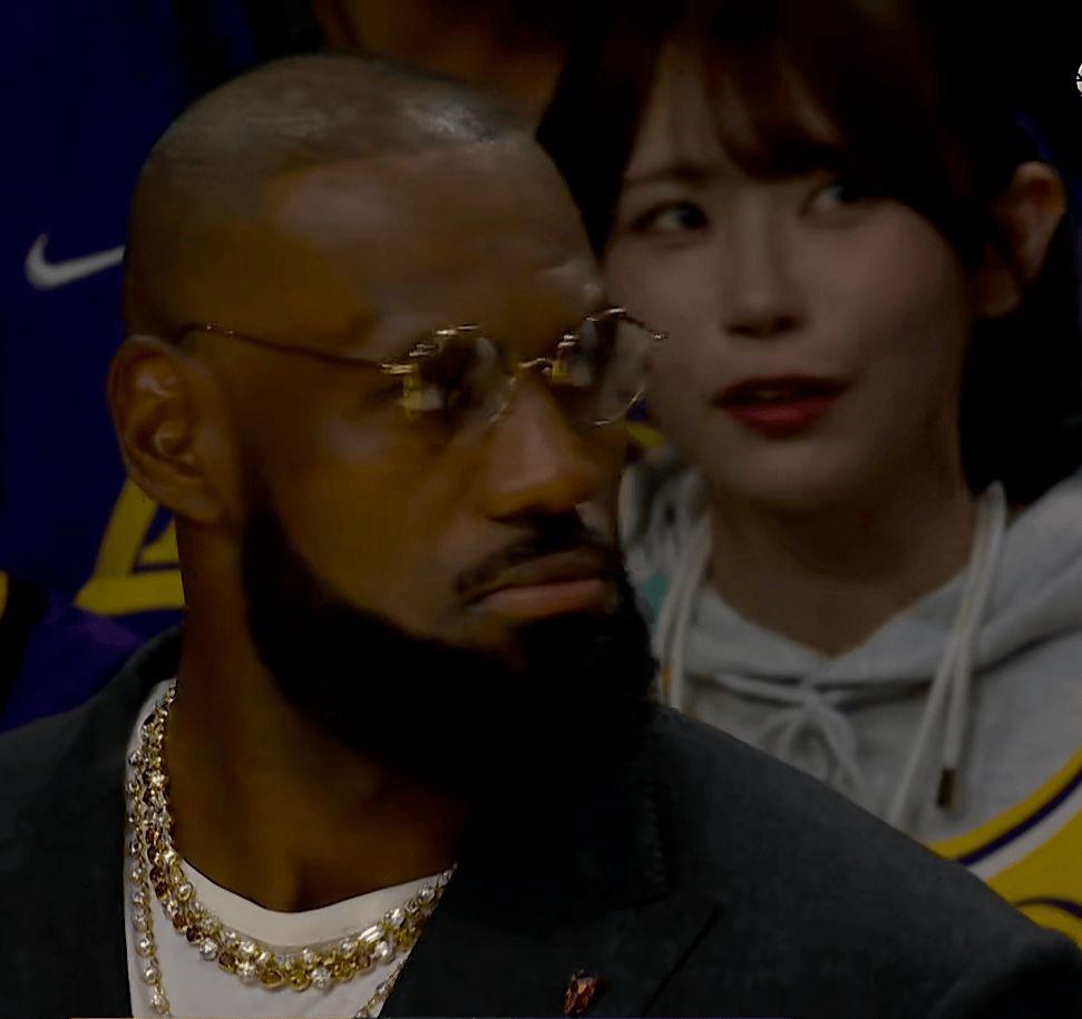比赛中有网友注意到,勒布朗-詹姆斯身后坐着一位日韩长相的美女观众。