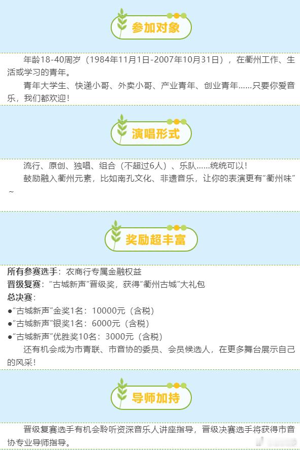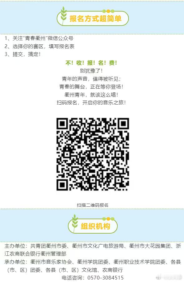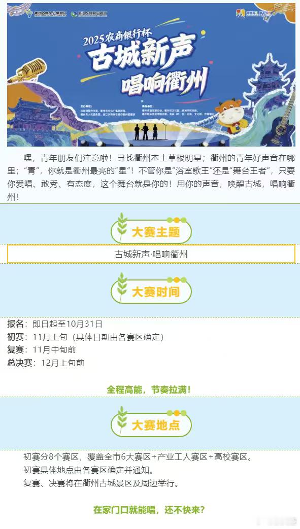 衢州身边事【衢州青年歌手大赛启动 万元冠军大奖等你来】衢州青年歌手们注意啦!由共青团衢州市委等多单位主办的农商银行杯•“古城新声”青年歌手大赛正式启动。报名自即日起至10月31日,年龄18-40周岁均可参加,个人和团队皆可,演唱形式不限,初赛将于11月上旬举行,如果你的实力过硬杀入决赛,还有机会角逐万元冠军大奖,快来报名吧!