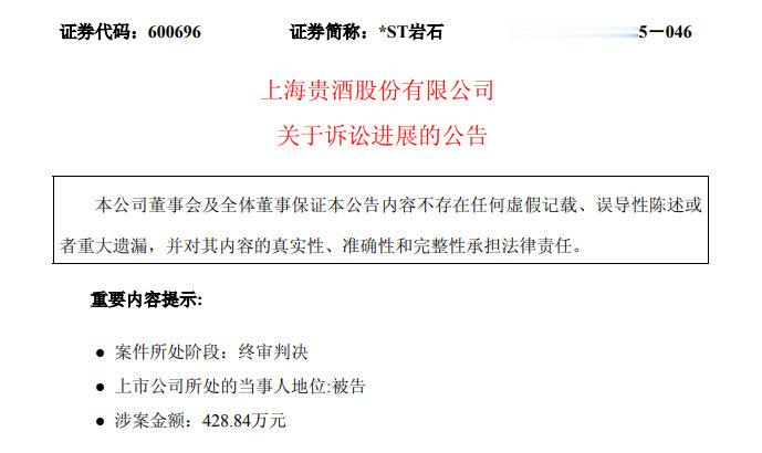10月10日,上海贵酒股份有限公司(证券简称:ST岩石,股票代码:600696.SH,以下简称“岩石股份”)披露诉讼终审判决,因侵害贵州贵酒集团商标权及不正当竞争行为,被判赔偿418.85万元并立即停用“贵酒”企业名称。