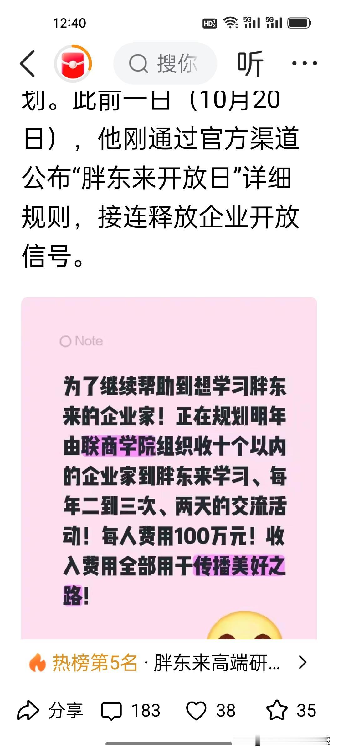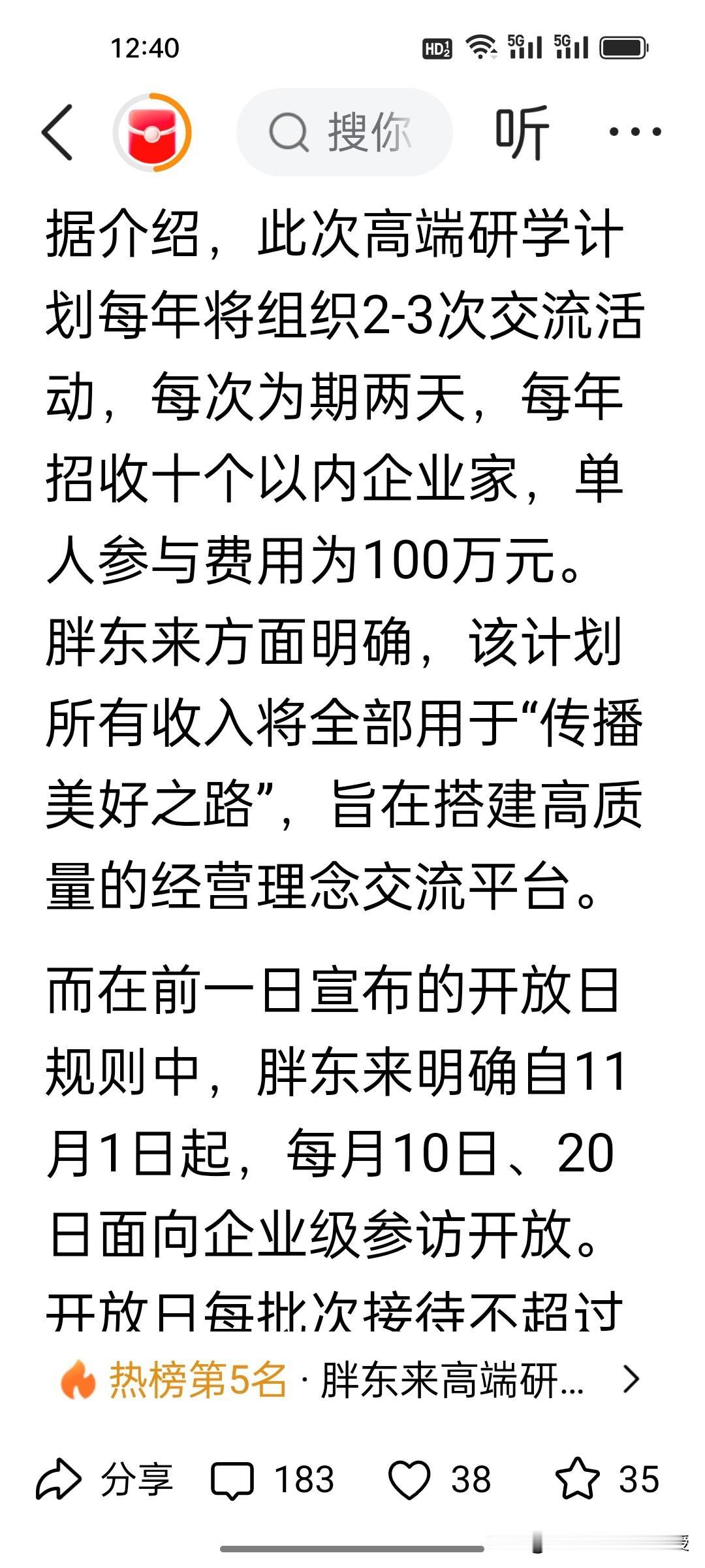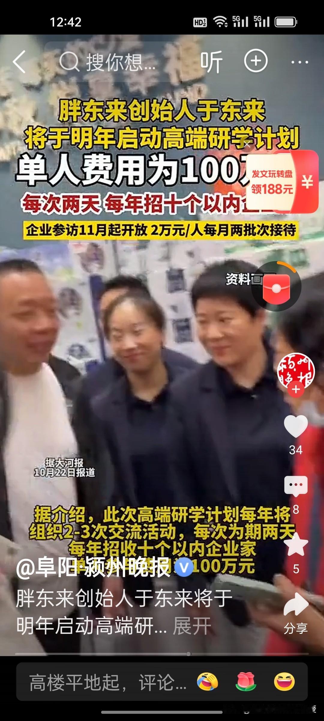 2天收费100万,一年只办2-3次,只招10人以内,胖东来推出的高端研学费用,大家看不懂看不懂,于东来是把自己当巴菲特了吗? 胖东来还有一个从下个月开始的参访活动,是2万元一天。胖东来官方解释是通过门槛限定人数,保障交流质量,目的并不是为了赚钱。 有人说这是于东来割韭菜,我倒不这么认为,2024年胖东来全年净利润8.05亿元,目前胖东来的现金储备高达41亿。于东来没有必要为了挣区区100万的研学费大费周折。我认为这是筛选有实力的,认同胖东来企业价值观的且真的是有钱的人,未来有可能进行更深入的合作,起到1+1>2的效果。