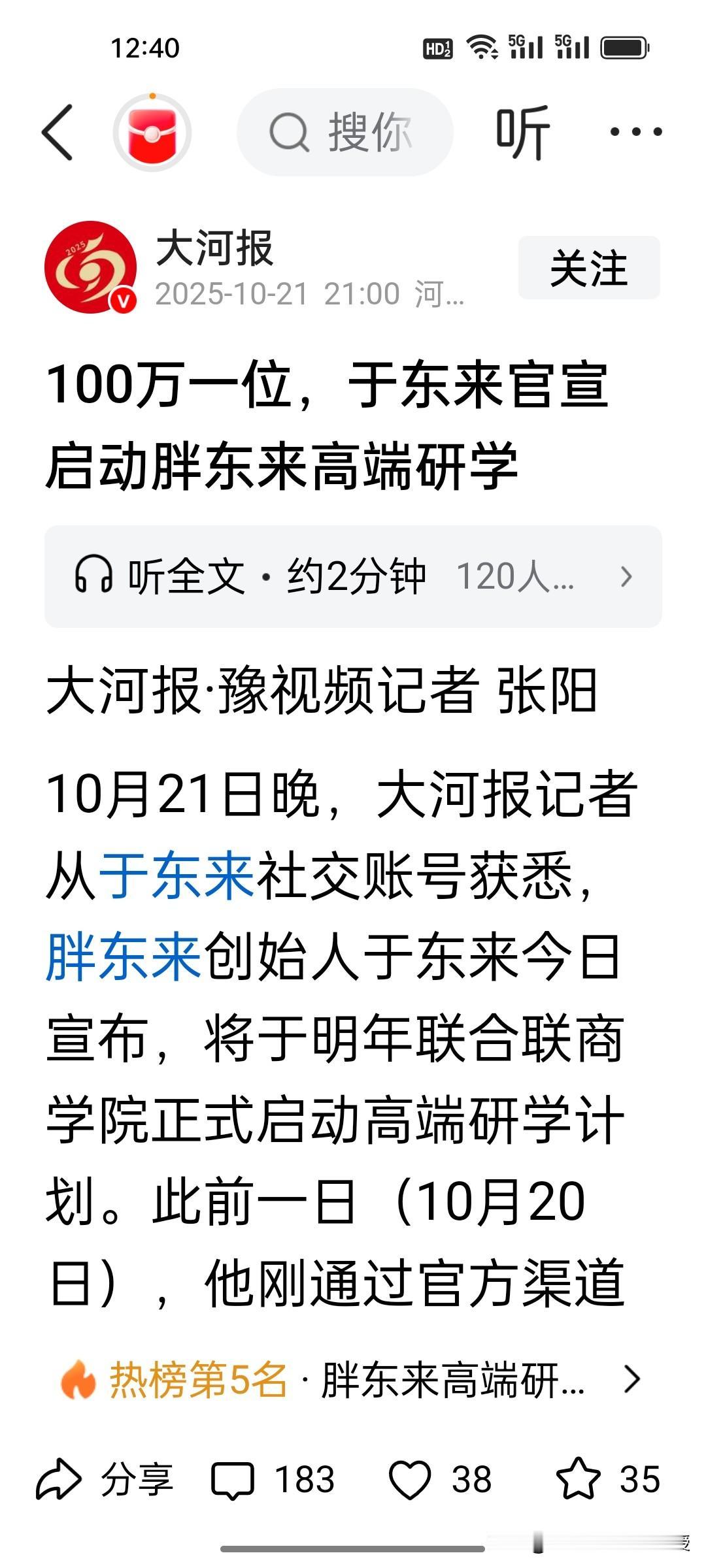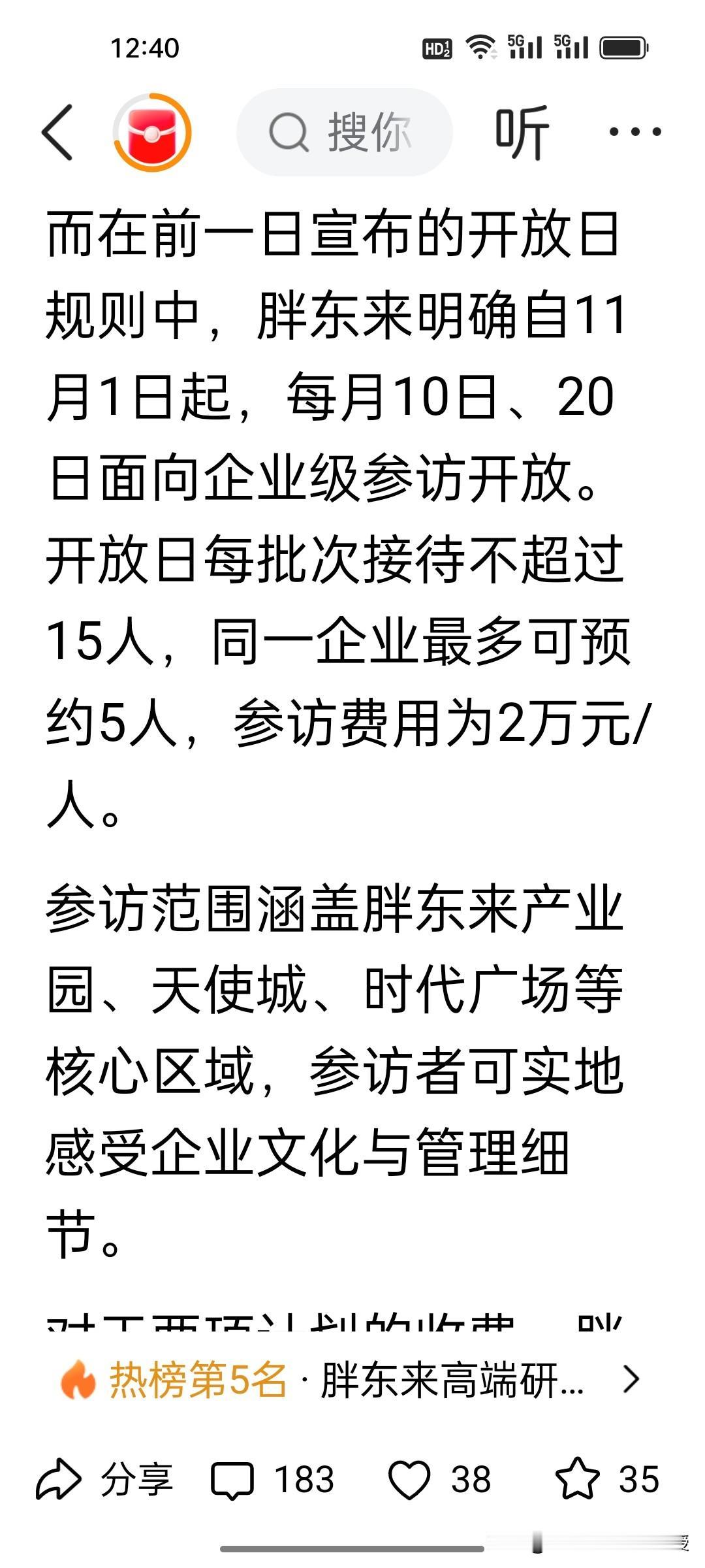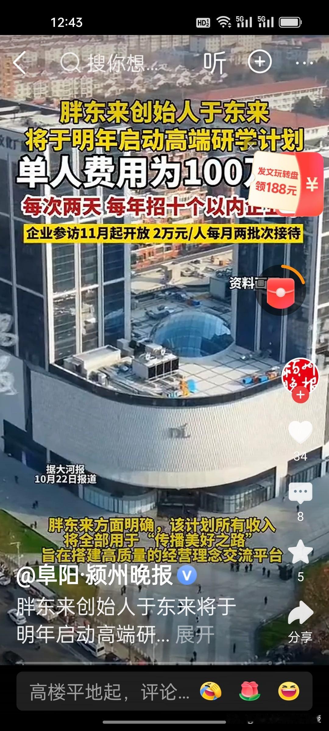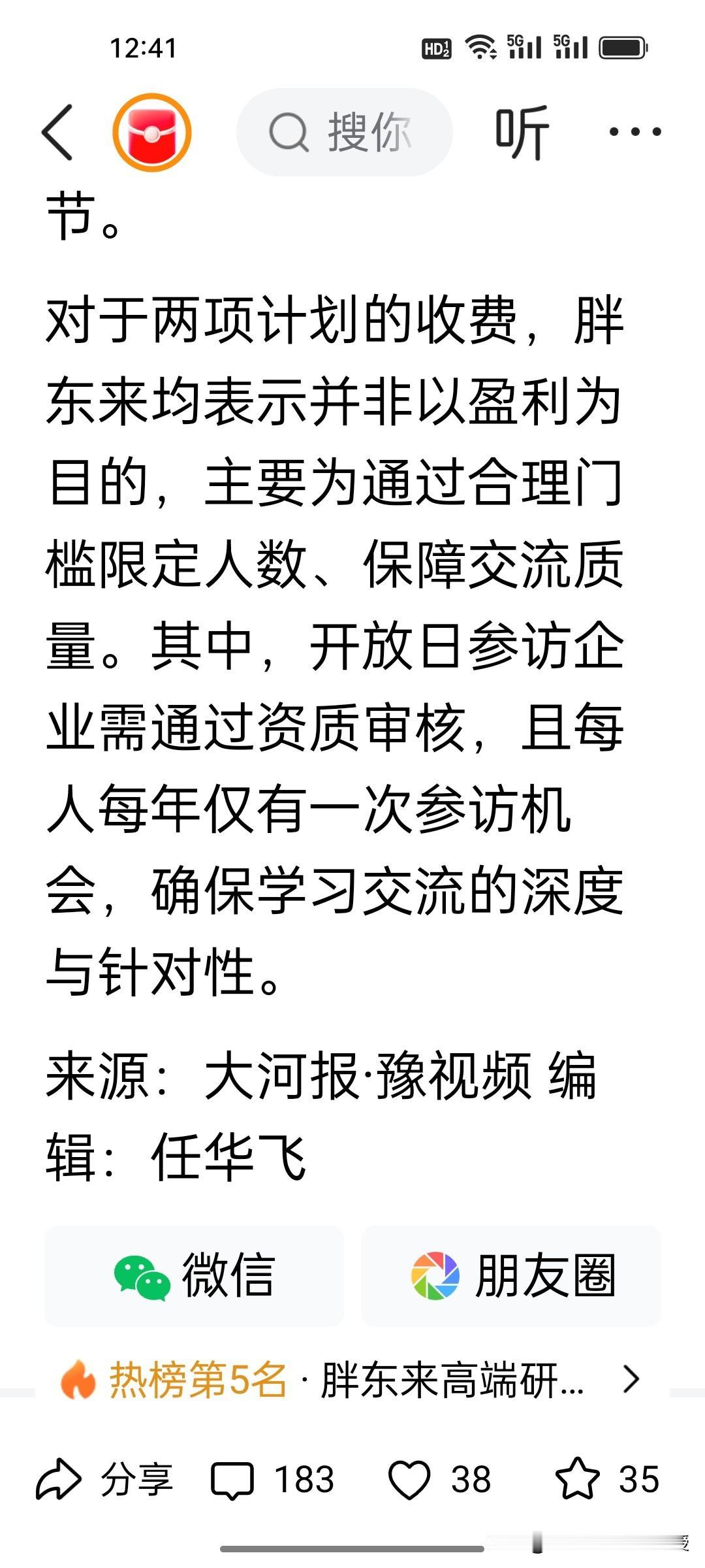 2天收费100万,一年只办2-3次,只招10人以内,胖东来推出的高端研学费用,大家看不懂看不懂,于东来是把自己当巴菲特了吗? 胖东来还有一个从下个月开始的参访活动,是2万元一天。胖东来官方解释是通过门槛限定人数,保障交流质量,目的并不是为了赚钱。 有人说这是于东来割韭菜,我倒不这么认为,2024年胖东来全年净利润8.05亿元,目前胖东来的现金储备高达41亿。于东来没有必要为了挣区区100万的研学费大费周折。我认为这是筛选有实力的,认同胖东来企业价值观的且真的是有钱的人,未来有可能进行更深入的合作,起到1+1>2的效果。