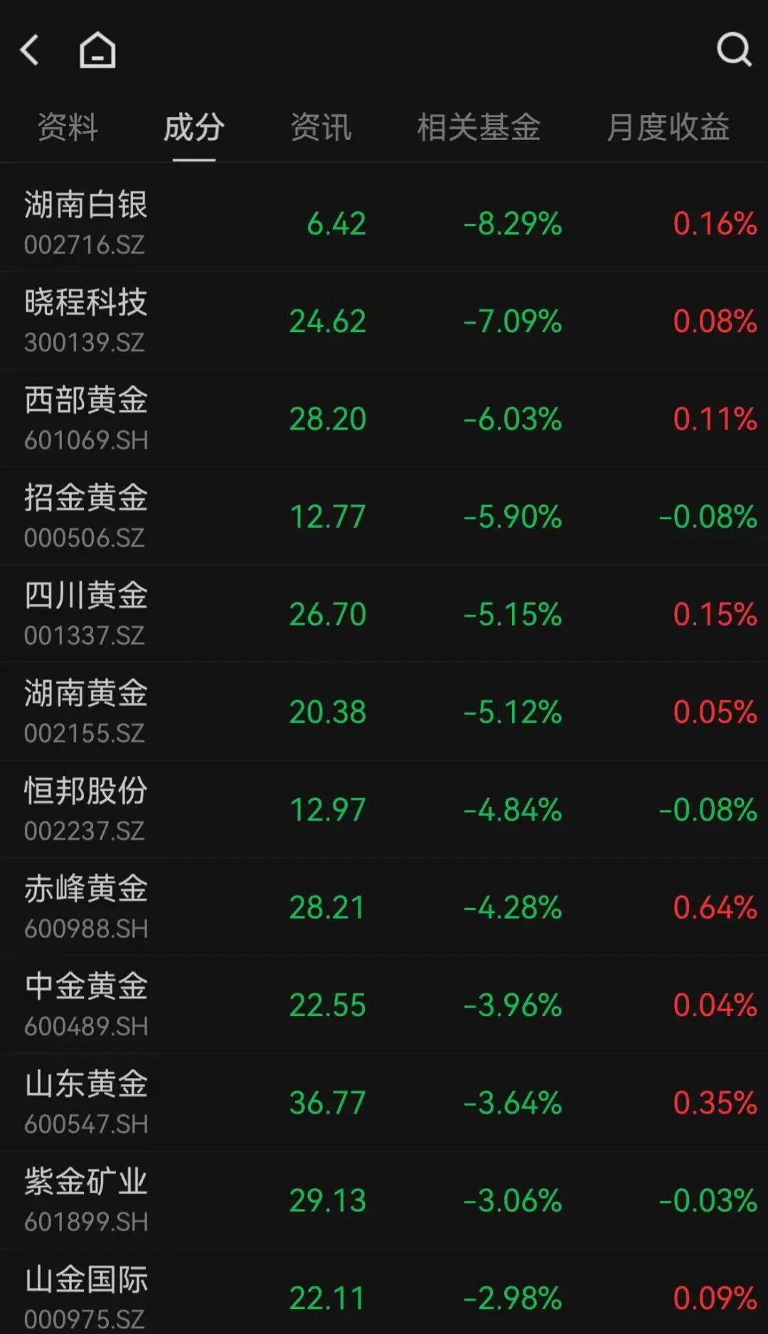 贵金属板块集体走弱。隔夜市场上,黄金创出12年来最大单日跌幅。