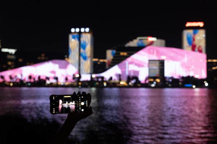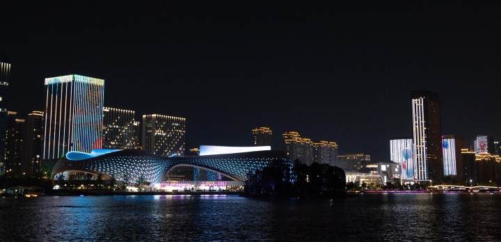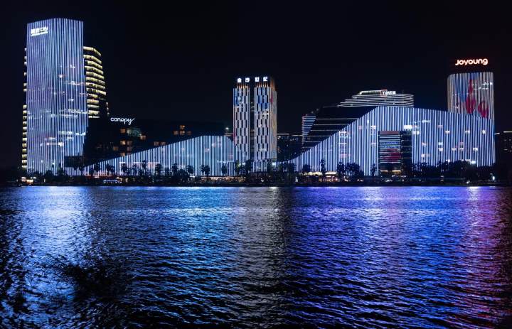 近日,金沙湖新版灯光秀亮相。每晚7点,金沙湖大剧院附近许多高层建筑换上“新皮肤”,上演流光溢彩的灯光秀。