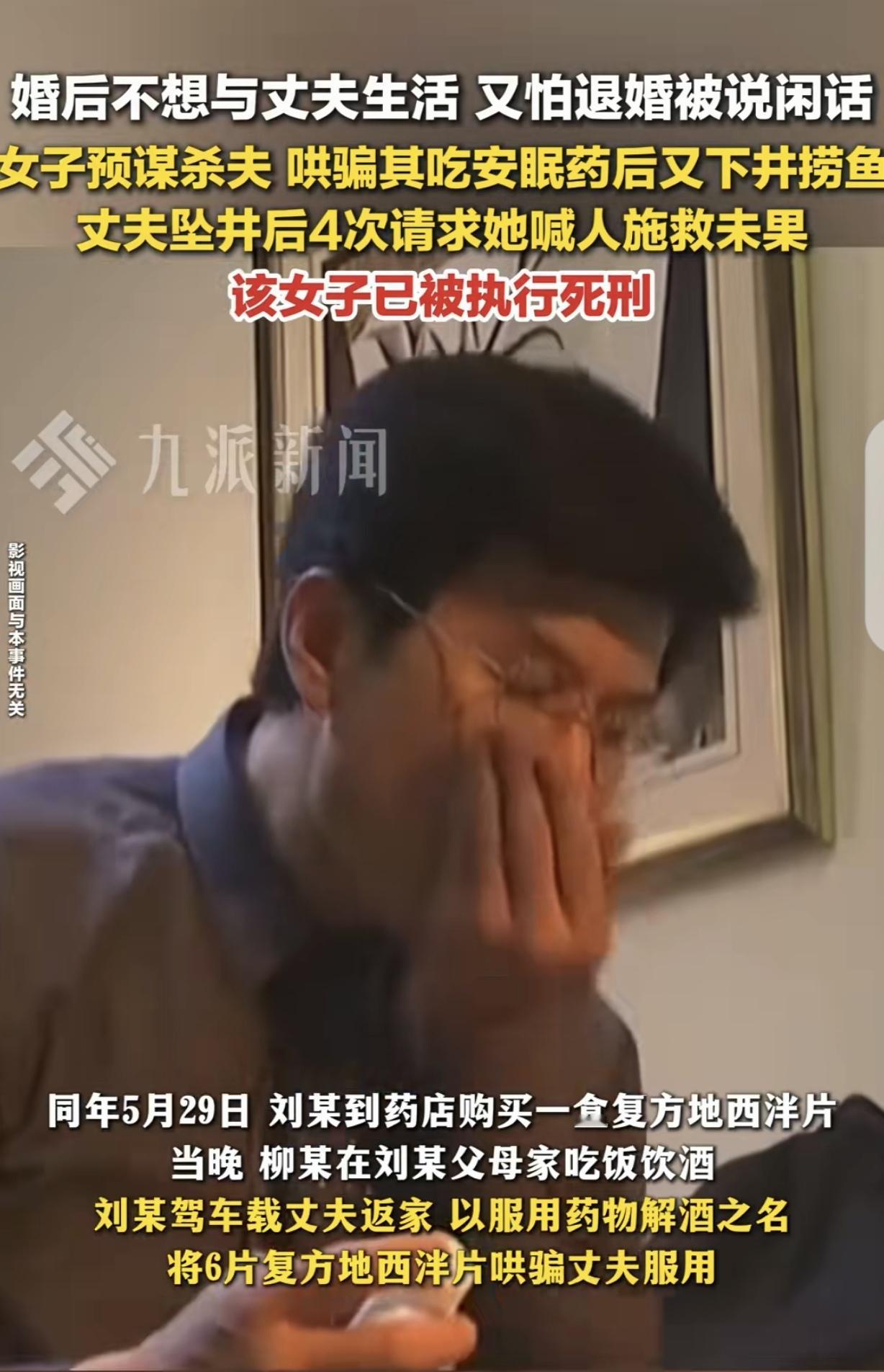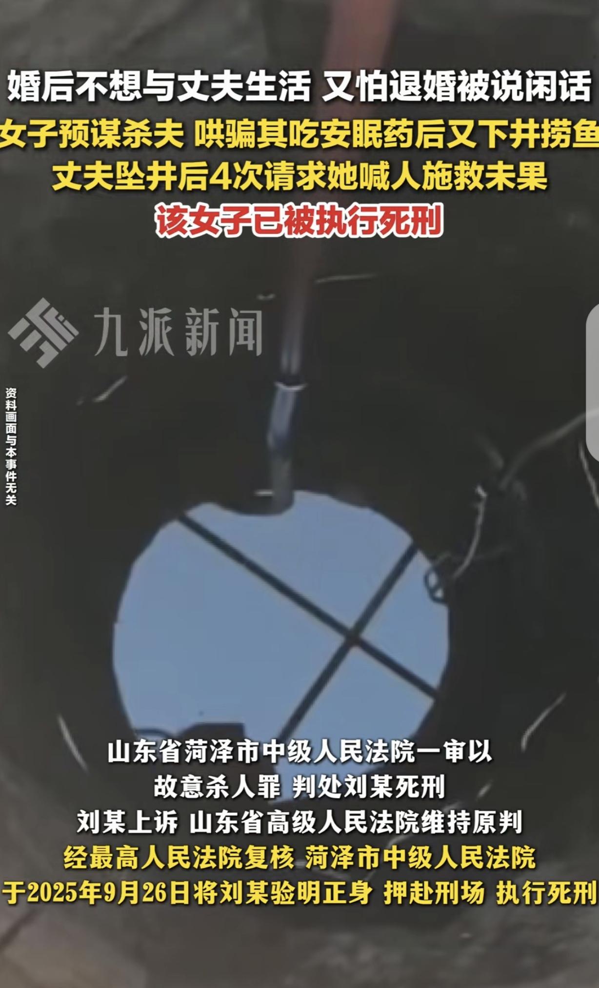 山东菏泽,一女子结婚2个月就后悔了,退婚又怕被人说闲话,她决定把丈夫除之后快,她在娘家把丈夫灌醉,让他吃了6片药说解酒,然后强迫他下井捞鱼,丈夫坠井后,4次哀求她喊人救自己,可女子却害上井盖扬长而去,导致丈夫身亡。案子经过2审,法院的判决让人拍手称快。 2023年3月,21岁的女子刘某披上嫁衣,在亲戚朋友的祝福声中,嫁作他妇,成为同村男子柳某的妻子。 婚后的生活归于平淡,很快,刘某就对婚姻心生厌倦,尤其是一看到丈夫就烦的不行,怎么看他都不顺眼,觉得自己如果跟他过一辈子,那就亏大了。 按理说,婚姻自由,包括结婚自由和离婚自由,如果过不到一块去,那就好合好散,谁也不耽误谁。 但刘某却不打算离婚,因为那样会被人说闲话,即使她不顾颜面,但父母被人戳脊梁骨没法做人。 可不能离,又过不下去,到底怎么办?思来想去,刘某心里一横,决定把柳某除之后快,让他从自己眼前和世界里彻底消失。 这个念头一冒出来,就再也按不下去了,经过一段时间的盘算,刘某决定付诸于行动。 2023年5月29日,也就是他们新婚2个多月后,刘女士开始筹备了,她先去药店买了盒复方地西泮片,然后,刘某开车带着丈夫回了娘家。 刘某在娘家对柳某软语温言,又让父母给他做了一桌子好酒好菜,父母看女儿女婿回来,还这么恩爱,心里高兴,美味珍馐做了一大桌。 刘某把柳某灌醉,然后拉着丈夫回家,路上,她给柳某了6片药片,谎称是解酒药,让他吃下。 柳某看平时对自己冷若冰霜的刘某,对自己一反常态,以为她从此以后要跟自己夫妻同心好好过日子了,对她的“关心”,自然是受宠若惊,并且言听计从。 晚上10点多,刘某拉着柳某,来到她事先计划好的机井旁,说井里有鱼,让柳某下去捞鱼。 刘某的计划是,柳某很快药劲发作,再加上喝多了,肯定会坠井溺亡。 柳某虽然不情不愿,但看到刘某一脸愠怒,柳眉倒竖,不想惹她不高兴,就硬着头皮下了井。 结果可想而知,柳某脚下一滑坠入井内,吓得他浑身哆嗦,赶紧大喊着哀求刘某快去找人救自己。 这就是刘某想要的结果,她怎么可能找人施救,她巴不得柳某葬身井底。 柳某哀求了4次,刘某充耳不闻,就坐在井边,看着柳某垂死挣扎,然后一点点失去生命。 凌晨2点多,她再也听不到柳某的动静了,知道他已经没了,然后决绝的盖上井盖,扬长而去。 可怜的柳某,娶妻不贤,最终在她的算计下,因缺氧窒息导致呼吸衰竭身亡。 他到死才知道,最狠枕边人,竟然无情又残忍的剥夺了他的生命,他带着不甘和怨恨,无奈的离开了这个世界。 可天网恢恢疏而不漏呀,刘某最终被抓捕归案,她对加害柳某供认不讳,法院一审以刘某故意杀人罪,判处死刑。 刘某不服,提起上诉,高院维持原判,2025年9月26日,刘女士被执行死刑。 怕被说闲话就杀人灭口,这脑回路也是无语了。潘金莲要活着都得甘拜下风了,现在的人真狠啊!这样不怕被说闲话了,听不到了,这么狠,无冤无仇的?现在的人怎么了? 加害丈夫的时候这么狠,自己判死刑了还有脸上诉?婚后不想和丈夫生活,那是结婚前根本就没考虑好,没考虑好结什么婚?不想过就离呗,还怕退婚被说闲话,真是太无语了。 退婚怕说闲话就杀了他?这理由真荒谬,贪人家的彩礼钱不想退,蛇蝎心肠才是真吧?别的女人是拿到钱用离婚摆脱男方,她直接用药灭口,是不想只分一半财产,要全部独吞吗? 估计是相亲认识的吧,太毒了,我是女的都觉得太可怕了,不爱感觉排斥可以不结婚呀,那是一条人命怎么下得去手的? 这起案件里面的背景应该更耐人寻味,首先她为啥21岁这么早结婚?而且结了婚宁愿弄死他,也不愿意跟男方一起生活,说明她不喜欢这个男的,或者根本就不喜欢男人,所以应该是被父母逼婚,然后要不就是贪财,父母强势也不愿退彩礼,或者是农村老派思想作怪,怕离了婚名声不好,也受不了各种流言蜚语,回娘家也不好受,对方消失才是她最好的选择。 《刑法》第232条规定:故意杀人的,处死刑、无期徒刑或者十年以上有期徒刑;情节较轻的,处三年以上十年以下有期徒刑。 刘某因婚姻后悔、怕“退婚闲话”,产生“除掉丈夫”的明确动机,并通过精心策划,买复方地西泮片、灌醉丈夫、骗吃“解酒药”、带至预先选定的机井旁、积极实施强迫下井、阻断救援,丈夫坠井后4次哀求仍不呼救、盖井盖离去等行为,充分体现其希望丈夫死亡的直接故意,从筹备到实施的每一步,均以“致柳某死亡”为目标。 刘某的行为并非“意外”,而是通过多重手段叠加制造死亡风险,大幅削弱柳某的意识与行动能力,复方地西泮片具有镇静、催眠作用,与酒精叠加会加重中枢抑制。 在柳某坠井后,刘某作为唯一能及时救援的人,却坐视其垂死挣扎,最终盖井盖扬长而去——此“不作为”与“作为”具有同等杀人效果。 关注@灋律盐究员 学法辩是非,用法止纷争。