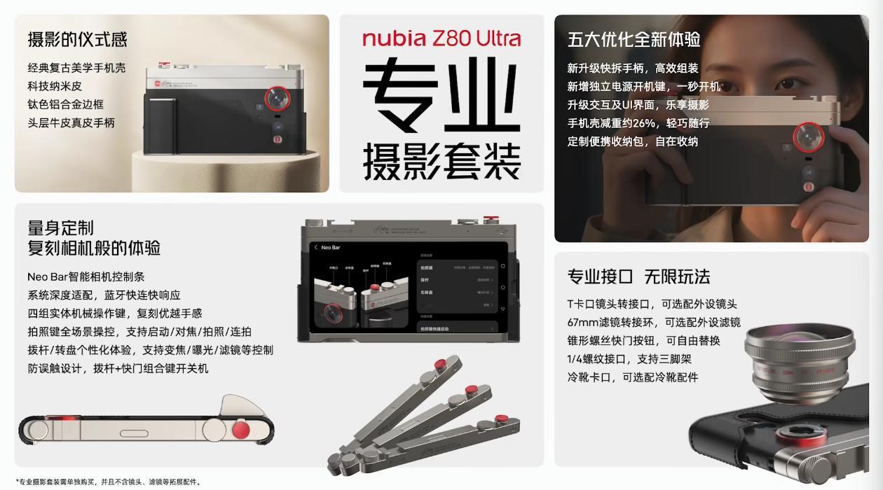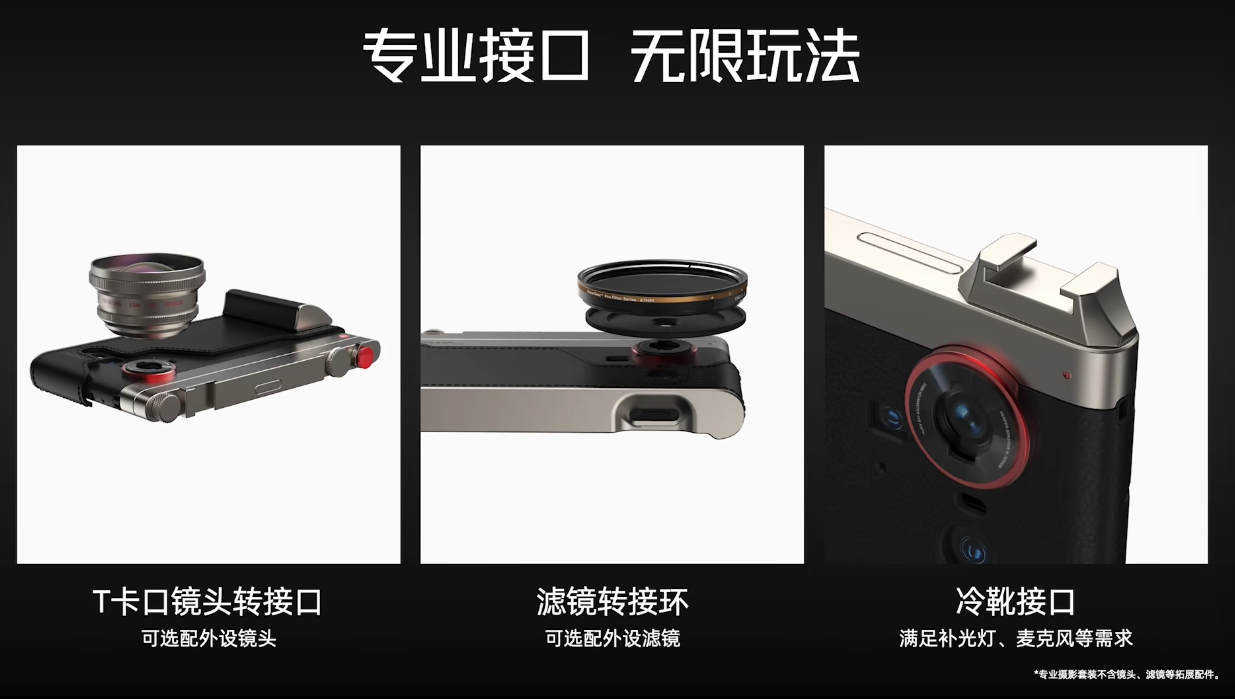 努比亚的摄影套装和另外几家风格明显不一样,组装方式、设计和质感、扩展转接都有自己的特点。不过就是没有增距镜,不能兼顾超长焦 努比亚Z80 Ultra