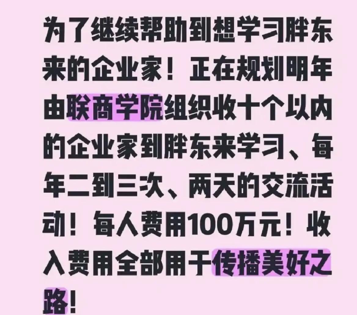 近日于东来官宣启动胖东来高端研学活动,可是在网上炸开了锅,不少网友纷纷觉得胖东来在走下坡路了,他们这么做就是在割韭菜。 为何网上传来如此多的质疑之声呢?因为胖东来这个高端研学活动可真不便宜,每一位来交流的企业家收费100万,不光是非常的贵,而且还有其他的条条框框的限制。参加的企业家人数要在10个以内,每年这样的活动只有2到三次,每次的时长是在2天。而很多人觉得胖东来是在割韭菜,其实是有三方面的原因,一个是因为这样的模式,跟市面上的一些所谓的大师割韭菜的模式是一样的。一个就是100万的收费的确是很高。还有一个就是大家没有看到效果。 可事实上胖东来这次研学为何要如此高的收费?其实本质上不过是在用这样的方式,来过滤掉一些人而已。我们之所以会觉得贵,其实是因为我们根本不是目标群体。人家面对的是一些企业家,而100万对于企业家来说并不算什么,而企业家更看重的是背后的价值。而且胖东来的研学活动,之所以敢于收费100万,也是因为人家是有这个底气的。对于胖东来的成就,我相信大家也是有目共睹的。单是今年上半年的合计销售额就高达117.07亿元。 而胖东来能取得如此成绩的背后,绝对不是偶然,而是因为人家有这个实力。而我们这些人,可能只看到了价格,看不到背后的价值。而且最关键的一点,哪怕不是一次研学活动,靠着胖东来牵头搭建的一个交流平台,一些企业家都能在这个平台上,找到自己的机遇,到时回报可是远超100元。并且我想说的是,胖东来这100万真的不算多,人家当年巴菲特一顿午餐,都能叫价到几百万,而且要知道这还是美元,换成人民币近千万了。外国人就能高价拍卖午餐就是物超所值,咱们自己人举办个高价研学就是割韭菜,这是不是有点双标了?