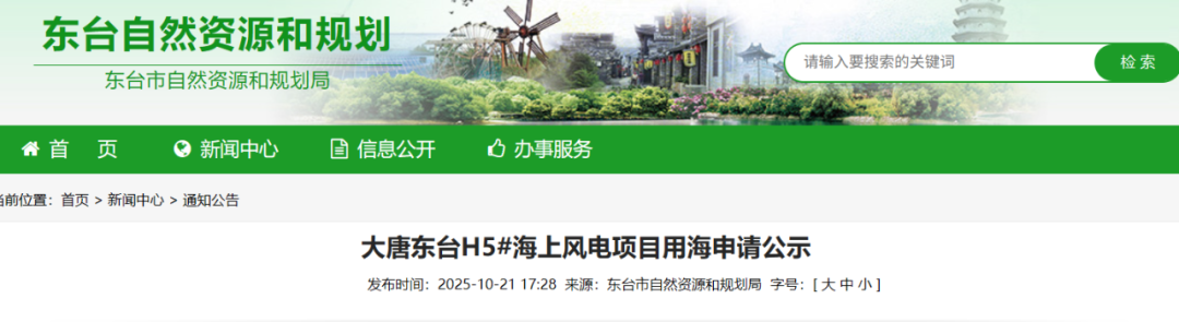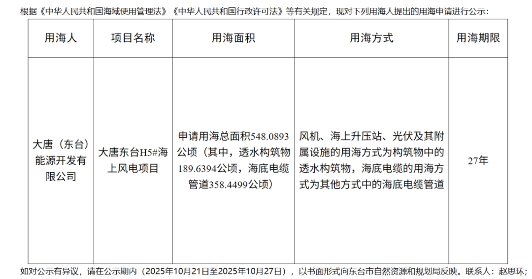10月21日,江苏省盐城市东台市自然资源和规划局发布《大唐东台H5#海上风电项目用海申请公示》。