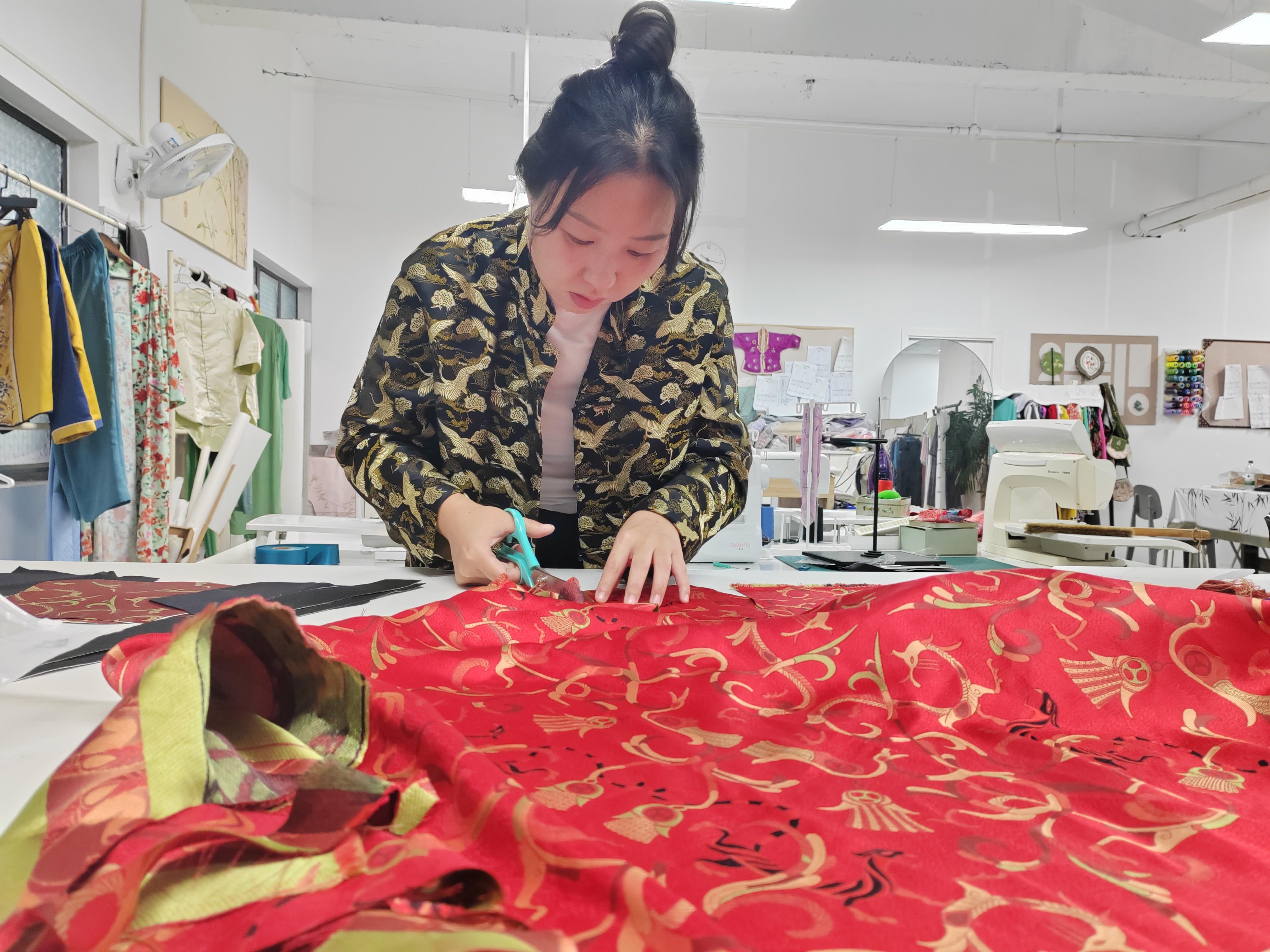 “在广州时,我就一直在思考如何将现代设计与传统文化融合。”回到荆州后,经过4年沉淀,2024年,张敏创立“张小裁服装工作室”。她带领一群宝妈学习楚服制作,希望那些沉睡在博物馆展柜中的华美服饰,能够走进现代人的生活。