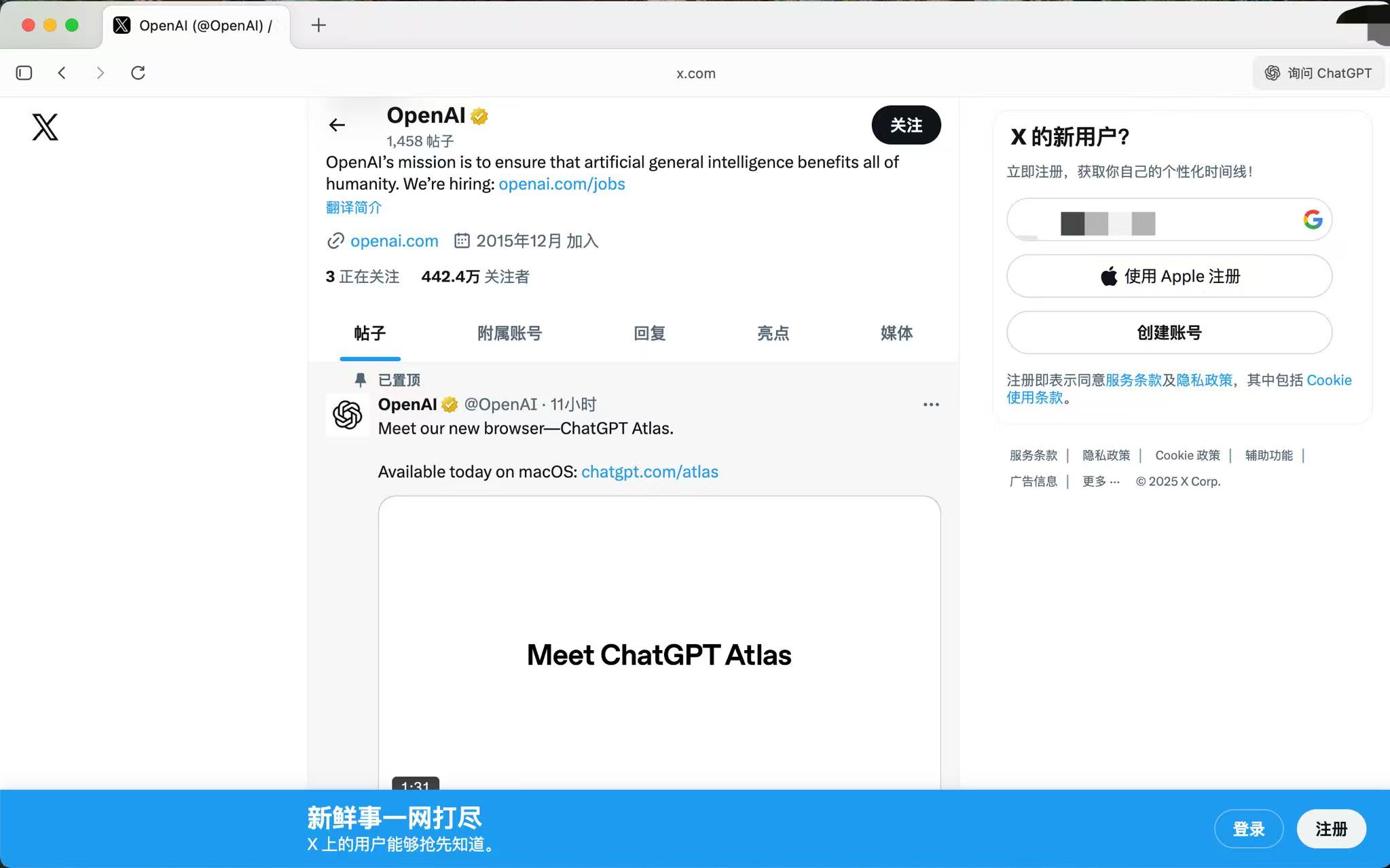 蓝鲸科技实测发现,用户可以通过ChatGPTAtlas浏览器直接访问各种网站。同时浏览器上方设有“询问ChatGPT”的选项,点击后可在侧边栏中与ChatGPT就网页内容进行互动,如要求其进行总结、帮忙比价或具体分析,无需再跳转到ChatGPT应用中。