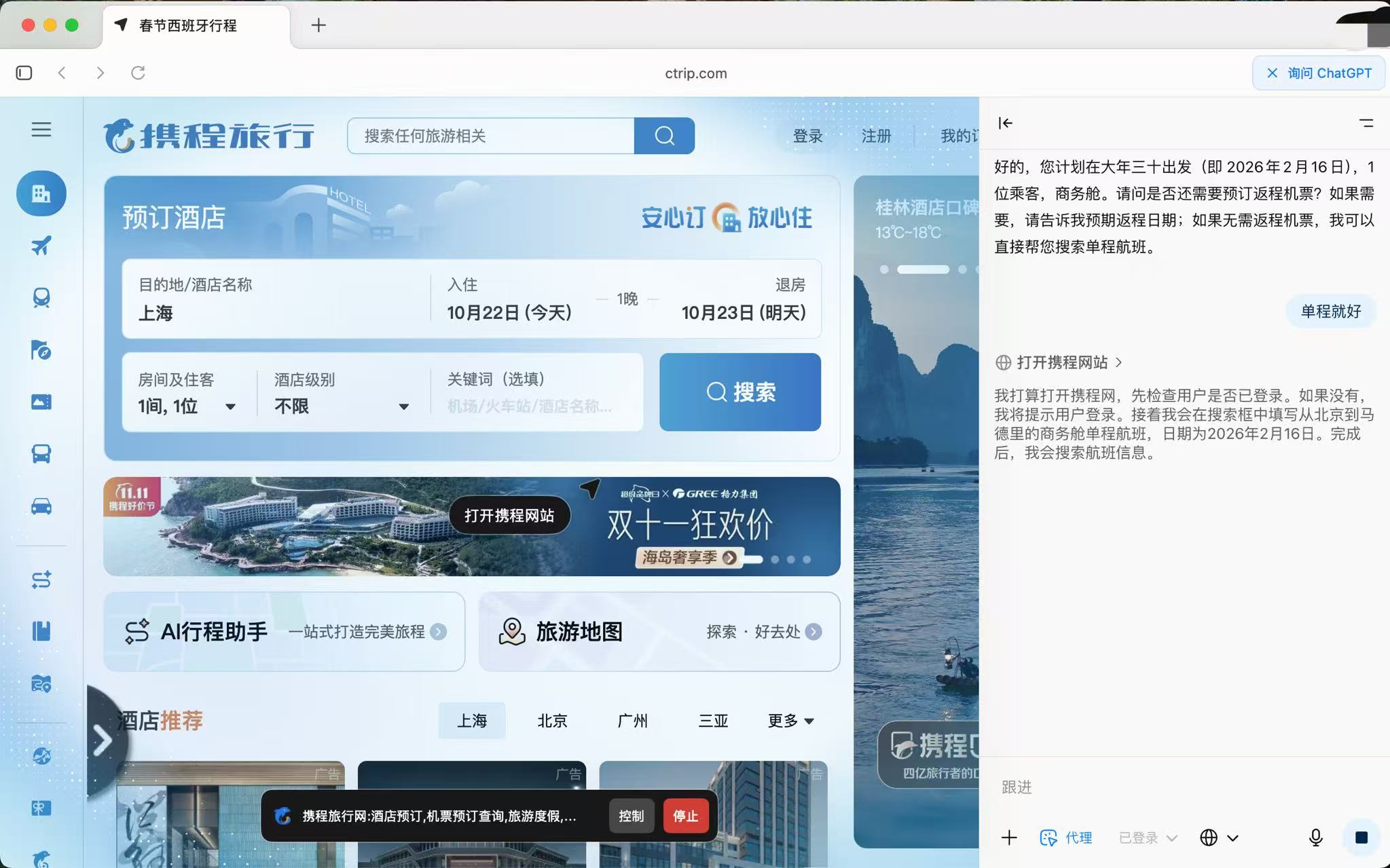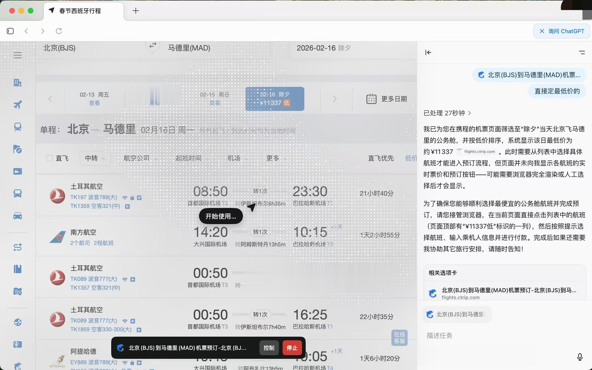 在蓝鲸科技实测中,进入Agent模式后,当提出“在携程上预订春节去西班牙马德里的机票”的请求时,ChatGPTAtlas会自动搜索并打开携程网站,通过控制鼠标和键盘来执行相关任务。过程中,该浏览器能够准确选择出发时间及地点,对比最优价格等信息。然而在需要登陆网页账号时,仍需人工接管操作。最终经过10分钟的尝试,Atlas还是未能成功进入预订流程,系统提示原因是“页面未显示各航班的实时票价和预订按钮”。