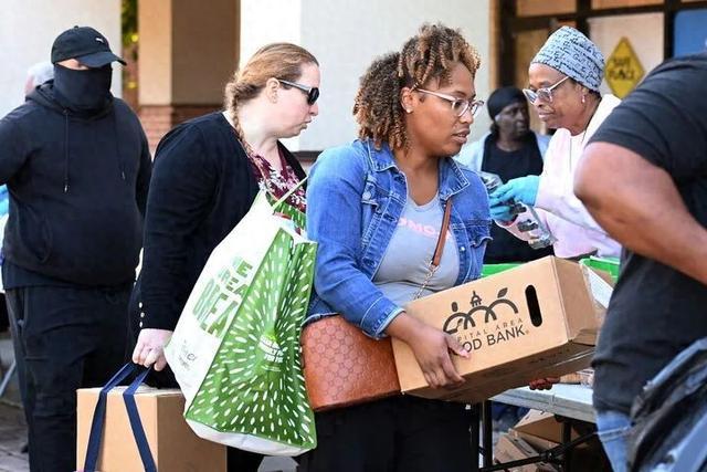 10月21日,在美国马里兰州海厄茨维尔市,联邦雇员领取免费食品。新华社记者李睿摄