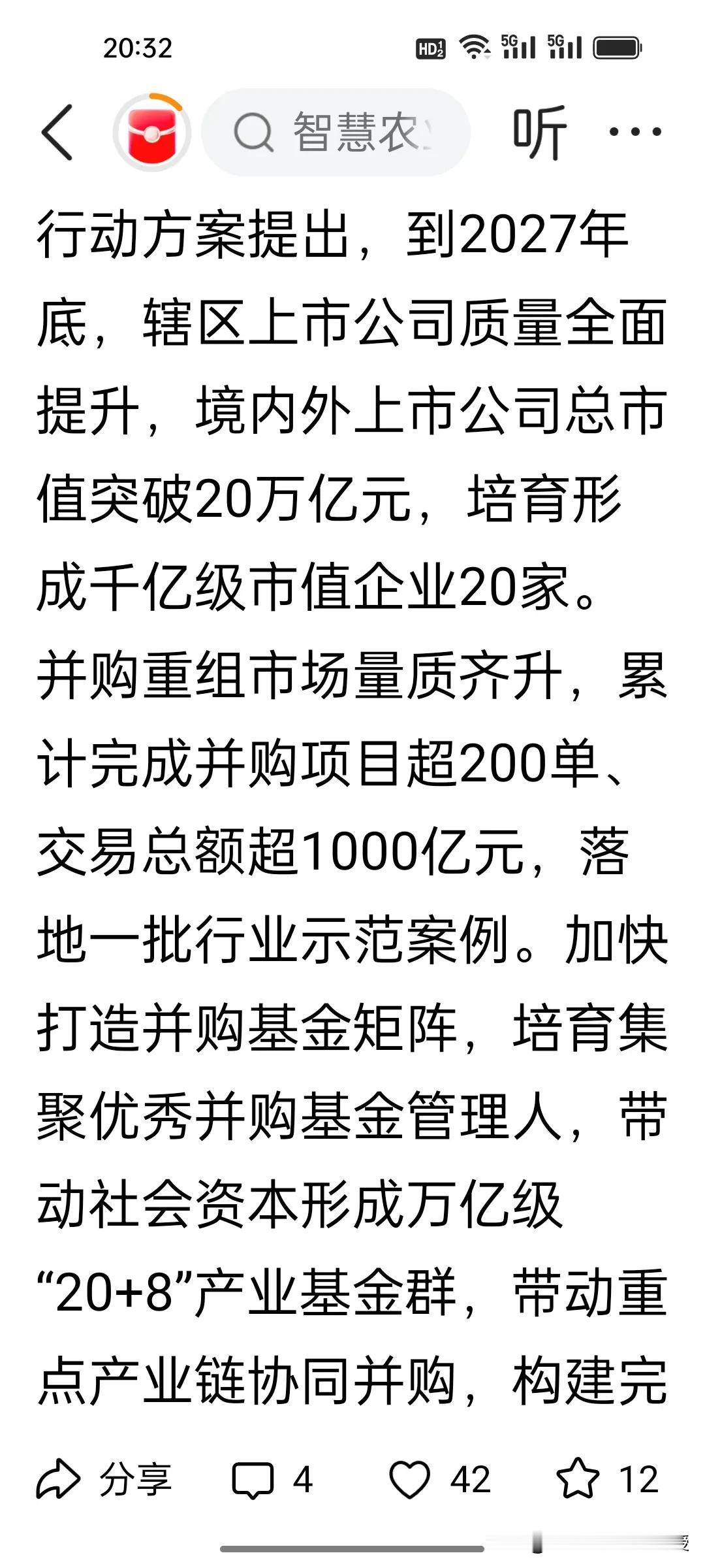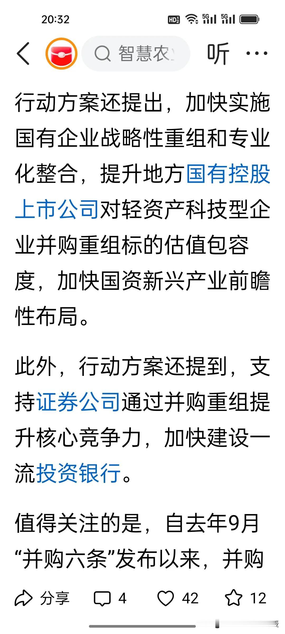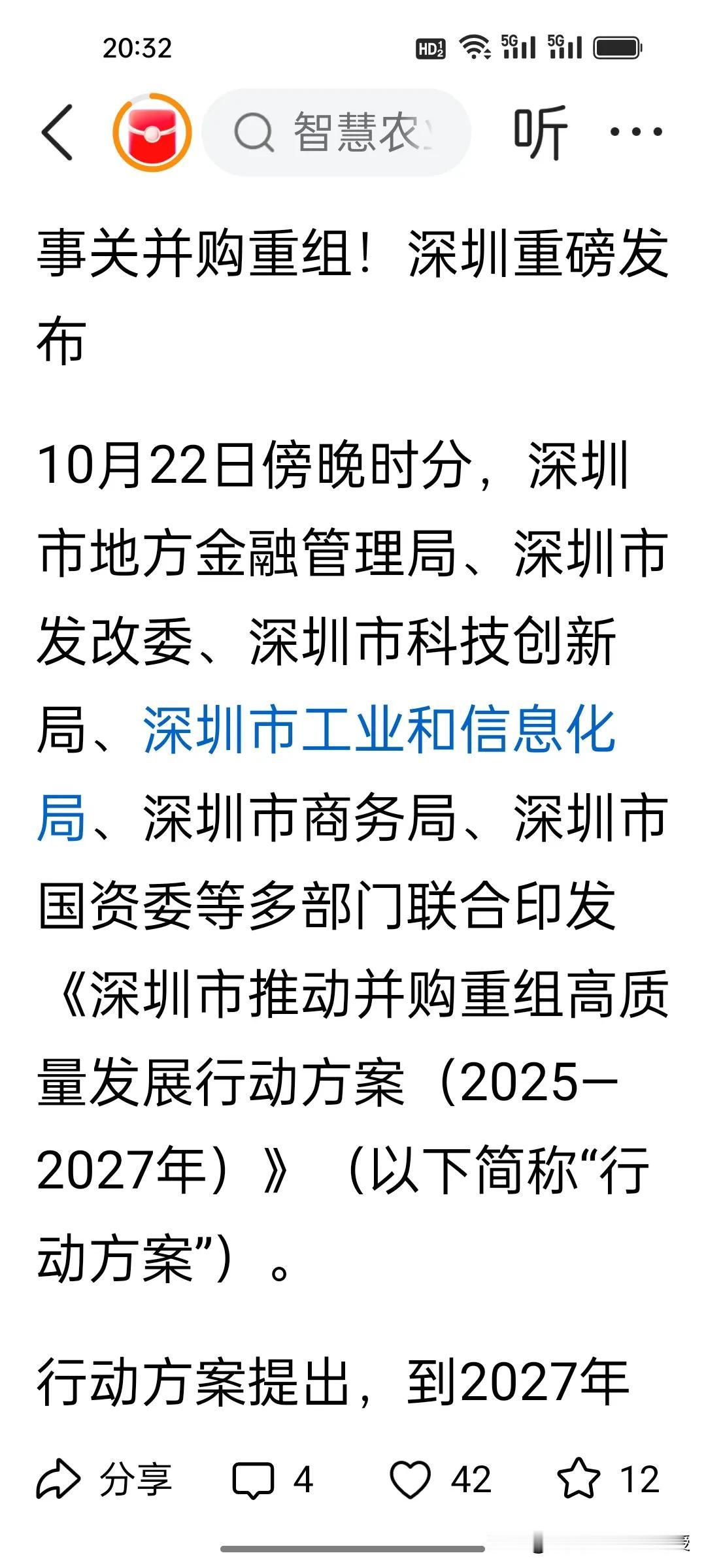 刚刚,深圳传来并购重组大利好!最近,各地国资改革正在加码落地,前天看到湖北大力推进国有“三资”管理改革,这两天河南国资大有能源,上海国资上实发展,武汉控股等国资概念在年底非常活跃,刚刚,深圳又传来大利好,根据《券商中国》消息,深圳市推动并购重组高质量发展行动方案出台了,最值得关注点是,方案中提到提升国资上市公司对轻资产科技公司并购重组标的估值的包容度,加快国企战略性重组和专业化整合。 这也意味着深圳将加快以资本为纽带,将优质科技资源注入国资上市公司的步伐,通过“国资+科技”的组合拳,让国有资本在新兴产业赛道上抢占先机、扩大版图。 从全国范围来看,预计今年各地国资都会迎来一场声势浩大的并购潮。这是各地在土地财政模式逐步弱化后,通过盘活存量资产、布局高附加值产业,寻找新利润增长点的最佳途径。