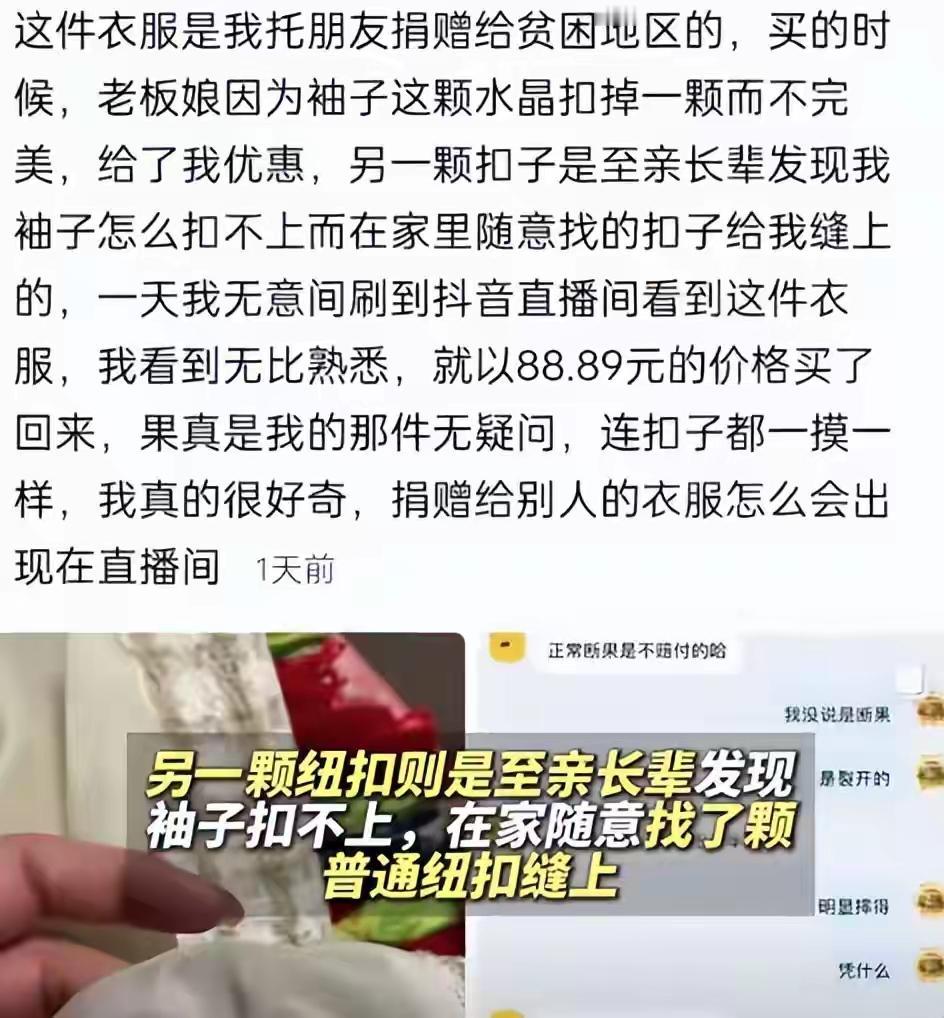 "离了大谱了"。四川,黄女士说,自己曾托朋友将一件白色蕾丝款衣物用于捐赠,因袖子一颗水晶扣缺失,老板娘当时还给了优惠,另一颗纽扣则是至亲长辈发现袖子扣不上,在家随意找了颗普通纽扣缝上。如今,却在某直播间“偶遇”同款,她抱着好奇以88.89元买回后,竟通过这颗独一无二的缝补纽扣,确认这就是自己捐赠的衣服。 这件看似普通的白色蕾丝衣服,竟然藏着一个令人震惊的秘密。黄女士原本只是出于善意,想为需要帮助的人献出一份心意,没想到却在无意中揭开了一段令人心酸的“人性迷局”。她的故事,或许只是千千万万个善举背后的小插曲,但其中所折射出的东西,却远比表面更为深刻。 你是否曾经也相信,善意会得到最纯粹的回报?可现实往往比童话更复杂。那天,黄女士在直播间偶遇自己曾捐赠的衣服,心中既有惊喜,也有疑惑。为什么那颗普通纽扣会成为唯一的“证据”?它到底代表了什么?是那份善意的印记,还是隐藏在背后的某种“交易”? 我们常说,善良是一种力量,但在这个世界上,善良也可能被利用、被误解。有人说,善意没有错,但如果善意被用作某种“筹码”,那它是否还纯粹?这件事引发了我深深的思考:我们在无私付出的时候,是否也要学会“识人”、学会“保护”自己?因为,善良不是无底洞,也不是用来被利用的工具。 更令人扼腕的是,黄女士的故事让我们看到一个令人心碎的现实:在利益的驱动下,有些人会变得多么“狡猾”。他们或许会利用别人的善意,甚至在无意中“偷走”了那份纯粹的信任。而那些看似普通的纽扣,背后却隐藏着一段令人唏嘘的故事——一个关于信任、关于人性、关于社会的真实写照。 这不仅仅是一个简单的“偶遇”事件,更像是一面镜子,映照出我们每个人心中的善与恶。我们是否还能相信这个世界?我们是否还能无畏地去付出?答案或许不在于外界的变化,而在于我们每个人心中的那份坚守。 读到这里,你是否也在心中泛起了涟漪?或许,我们都曾在善意的道路上迷失过,也都在某个瞬间被“利用”过。但请记住,善良永远不会过时。它像那颗纽扣,虽普通,却承载着最珍贵的信任和希望。只要我们心中有光,就能在黑暗中找到前行的方向。 这故事,远比表面复杂得多。它让我们反思:在这个充满诱惑和陷阱的社会,善意究竟该如何守护?而我们,又该如何用一颗温暖的心,去面对这个看似“善良”的世界?或许,答案就在每个人的选择里。捐赠