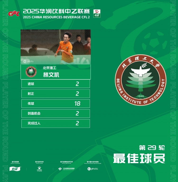 在2025华润饮料中乙联赛第29轮比赛中,北京理工足球俱乐部坐镇主场对阵赣州瑞狮。下半场第48分钟,林文凯在禁区内补射破门打破僵局。第64分钟,林文凯抢点头球破门,帮助球队扩大比分。最终,林文凯完成梅开二度,帮助北京理工3比0战胜对手。