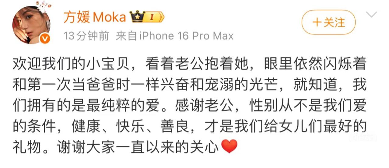 郭富城三胎得女,声称家里有了四个女神。 哈哈哈,郭富城的妻子方媛再次生女,至此已是三个女儿了。 郭富城发文感谢爱妻,表示无论儿子还是女儿都是珍贵的礼物,并称家已成为“女神之家”,被四位女神爱着。 方媛也发文感谢老公,性别不是他们爱的条件。 不得不说,郭富城真的很有女儿缘啊。 恭喜🎉。
