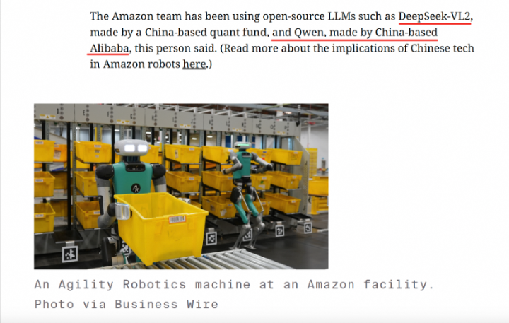 6月,据外媒报道,美国亚马逊公司正在加速布局人形机器人,并采用DeepSeek、阿里通义千问等开源的大语言模型进行机器人的操控。