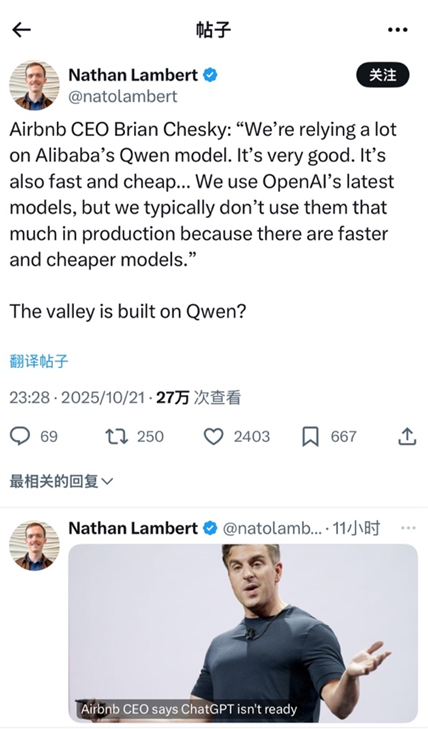 10月22日,爱彼迎AirbnbCEO布莱恩·切斯基在媒体采访中公开表示,公司正“大量依赖阿里巴巴的通义千问模型”,并直言“比OpenAI更好更便宜”。他同时表示,“我们也会使用OpenAI的最新模型,但通常不会在生产环境中大量使用,因为有更快、更便宜的模型可供选择。”