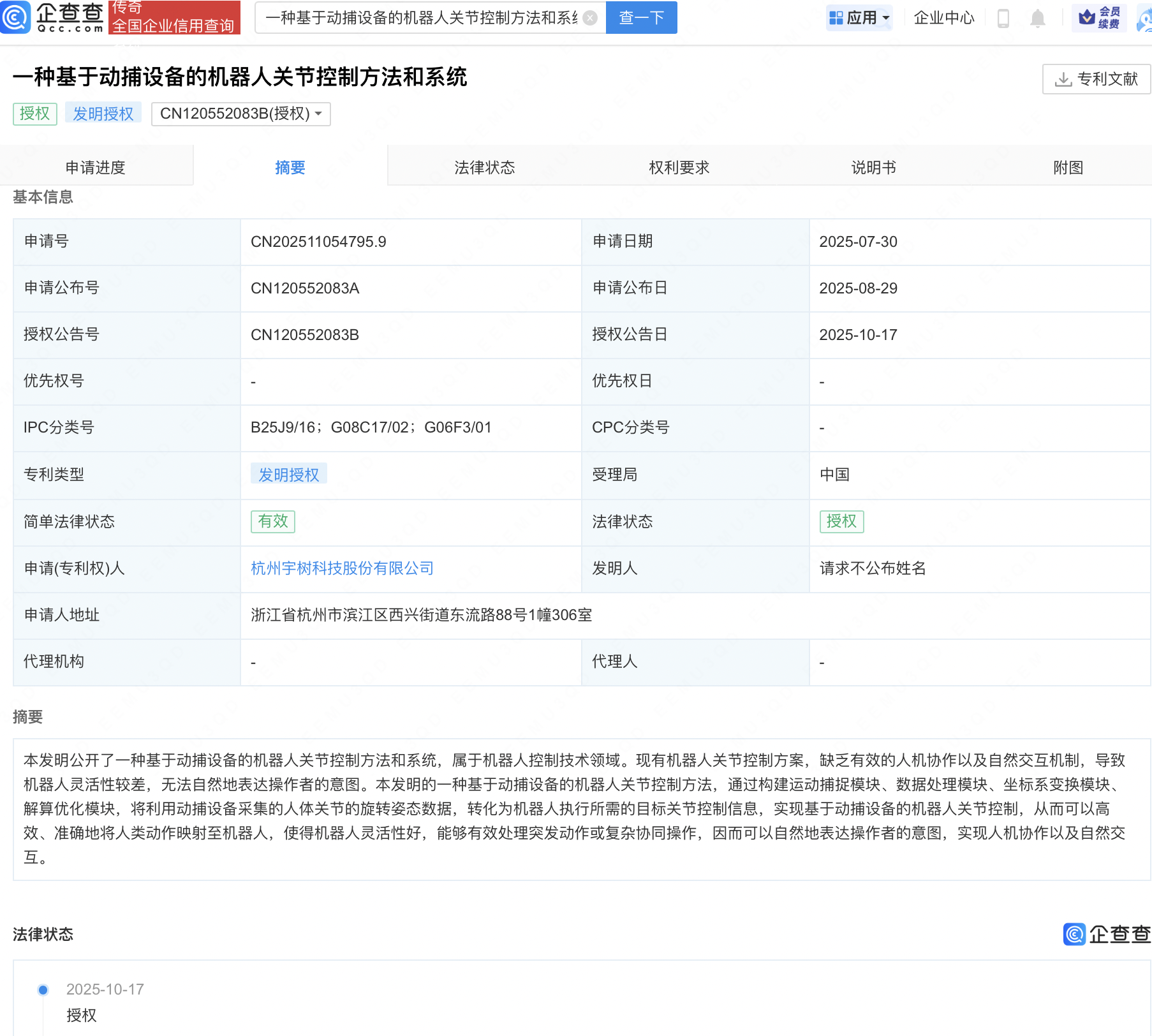 企查查APP显示,近日,杭州宇树科技股份有限公司“一种基于动捕设备的机器人关节控制方法和系统”专利获授权。企查查专利摘要显示,本发明属于机器人控制技术领域,现有机器人关节控制方案,缺乏有效的人机协作以及自然交互机制,导致机器人灵活性较差,无法自然地表达操作者的意图。本发明通过构建运动捕捉模块、数据处理模块、坐标系变换模块、解算优化模块,将利用动捕设备采集的人体关节的旋转姿态数据,转化为机器人执行所需的目标关节控制信息,实现基于动捕设备的机器人关节控制,从而可以高效、准确地将人类动作映射至机器人,使得机器人灵活性好,能够有效处理突发动作或复杂协同操作,因而可以自然地表达操作者的意图,实现人机协作以及自然交互。