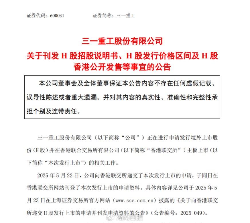 根据三一重工发布的最新公告,2025年10月20日,公司在香港联交所网站刊登并派发H股招股说明书,本次全球发售H股基础发行股数为5.8亿余股,其中,初步安排香港公开发售5804余万股,约占全球发售总数的10%;国际发售5.2亿余股,约占全球发售总数的90.0%。本次H股发行的价格区间初步确定为20.3港元至21.3港元。公司H股香港公开发售于2025年10月20日开始,预计于10月23日结束,并预计于10月27日公布发行价格,预计于10月28日在香港联交所挂牌并开始上市交易。回顾三一重工本轮冲击港股之路,用紧锣密鼓、节奏清晰形容最为合适。2月18日,三一重工发布公告称,正在筹划境外发行股份(H股)并在港交所上市事项,旨在推进公司的全球化战略,加强与境外资本市场的对接,并提升公司治理透明度和规范化水平。5月22日,公司向港交所递交上市发行申请。9月30日,中国证监会对公司此次发行上市备案信息予以确认。10月8日通过港股上市聆讯。从提交资料到通过聆讯,不过四月有余。10月28日,“上新”的港股将再添湖南元素,三一集团将正式成为其中一员。