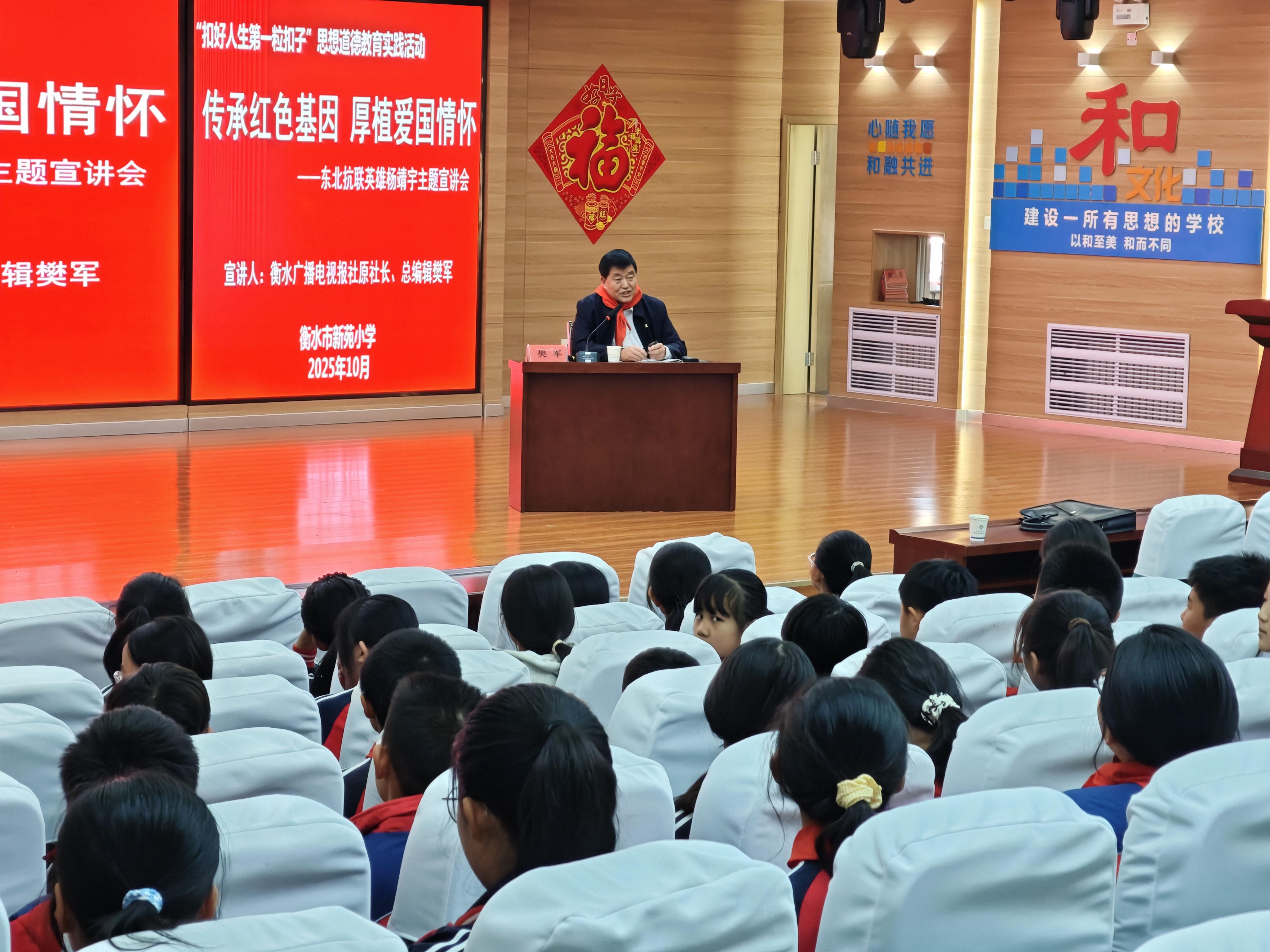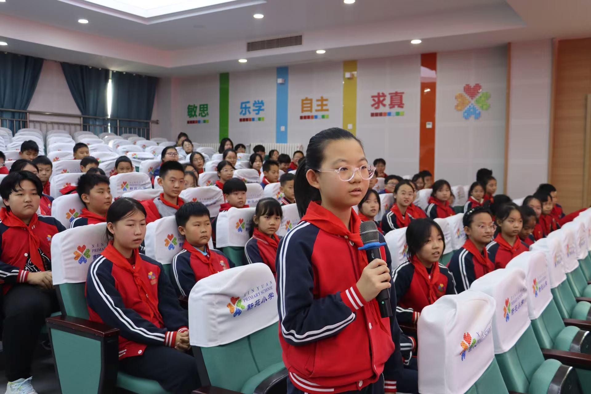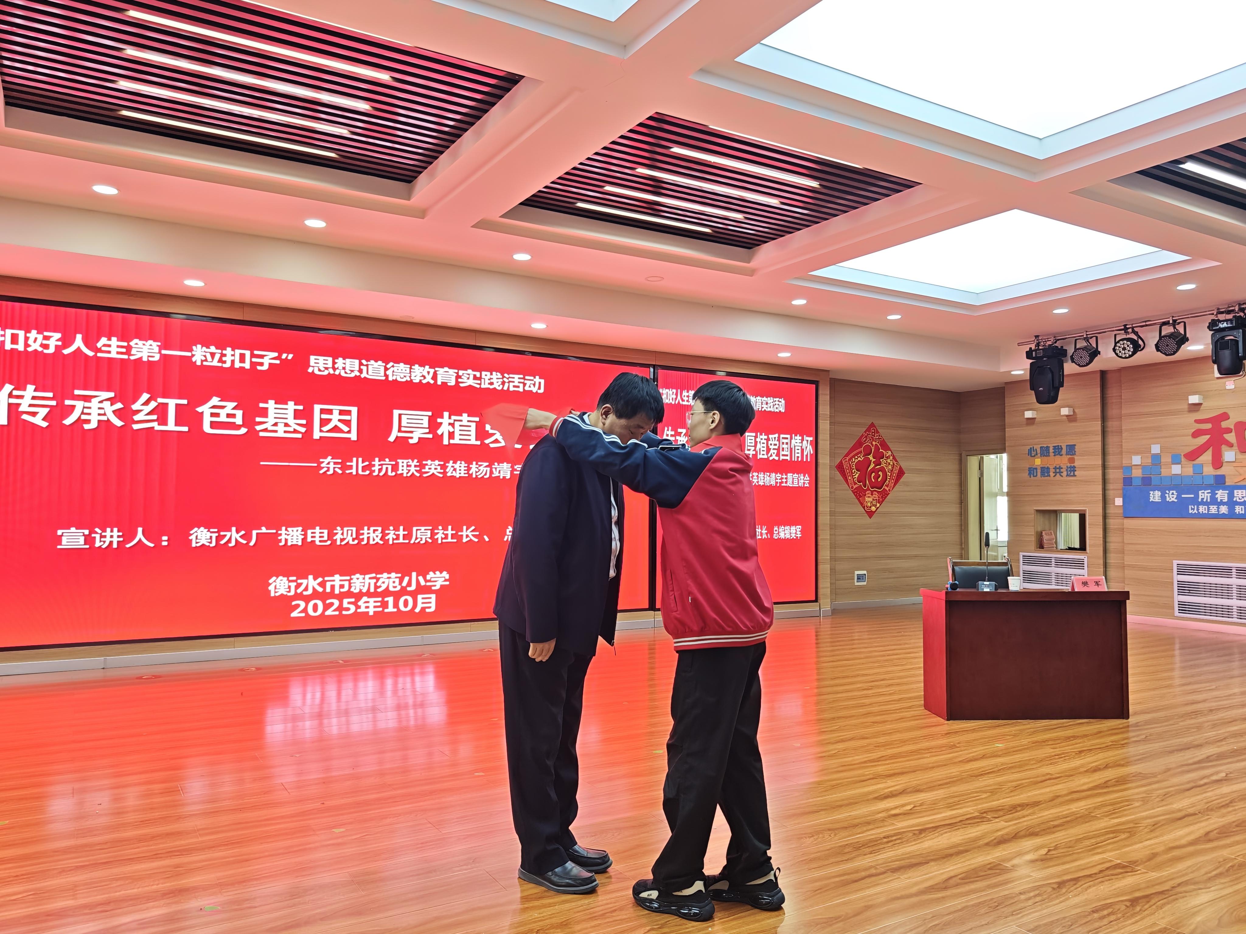 活动现场,少先队员代表为宣讲人樊军佩戴红领巾,孙会芳副校长为樊军发放聘书。