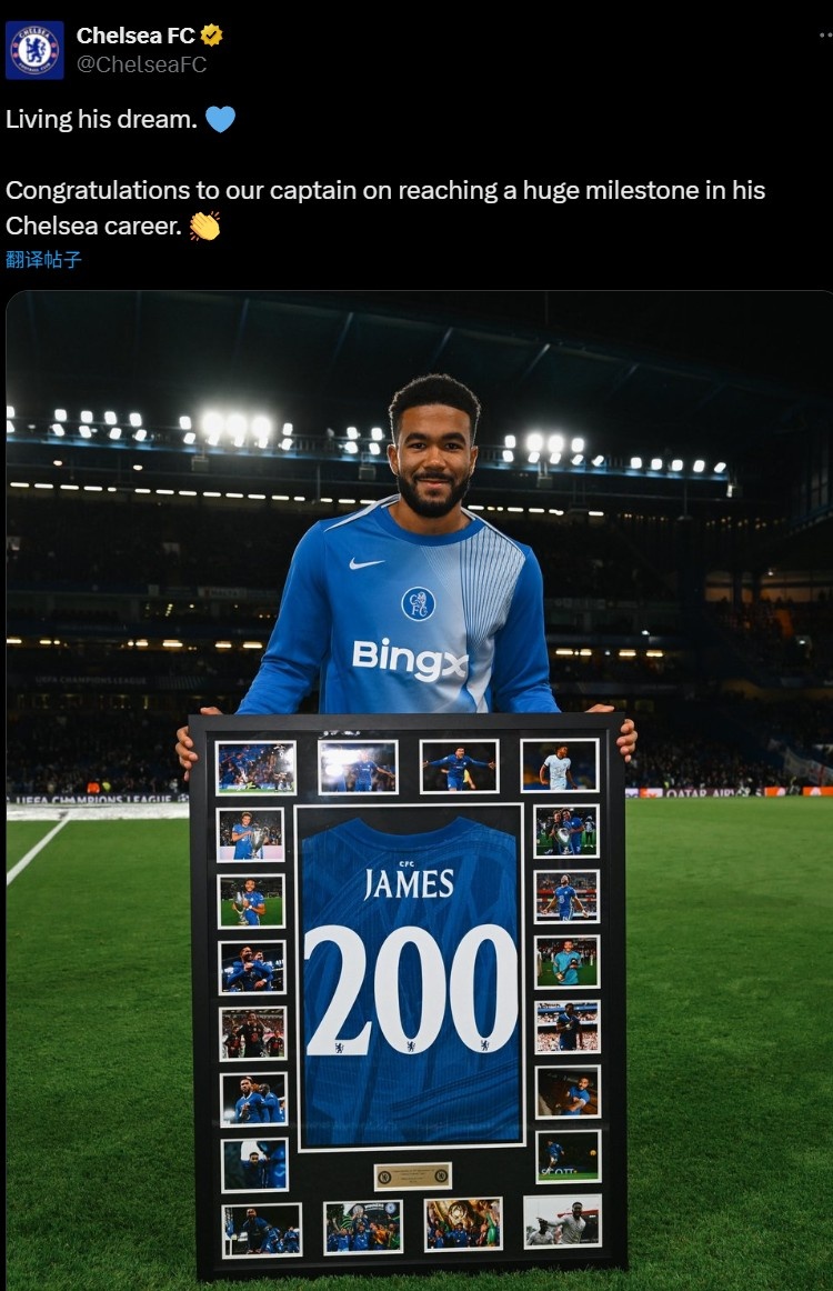 里斯-詹姆斯在本场比赛达成切尔西生涯200场里程碑,他在赛前也展示了俱乐部为其赠送的纪念相框,主体为印有200字样的他本人的球衣,周边则是包括捧得世俱杯和欧冠在内的高光时刻。