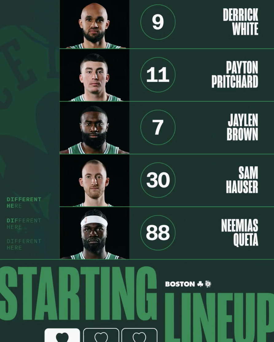 凯尔特人今日首发:怀特,普里查德,杰伦-布朗,豪瑟和克塔