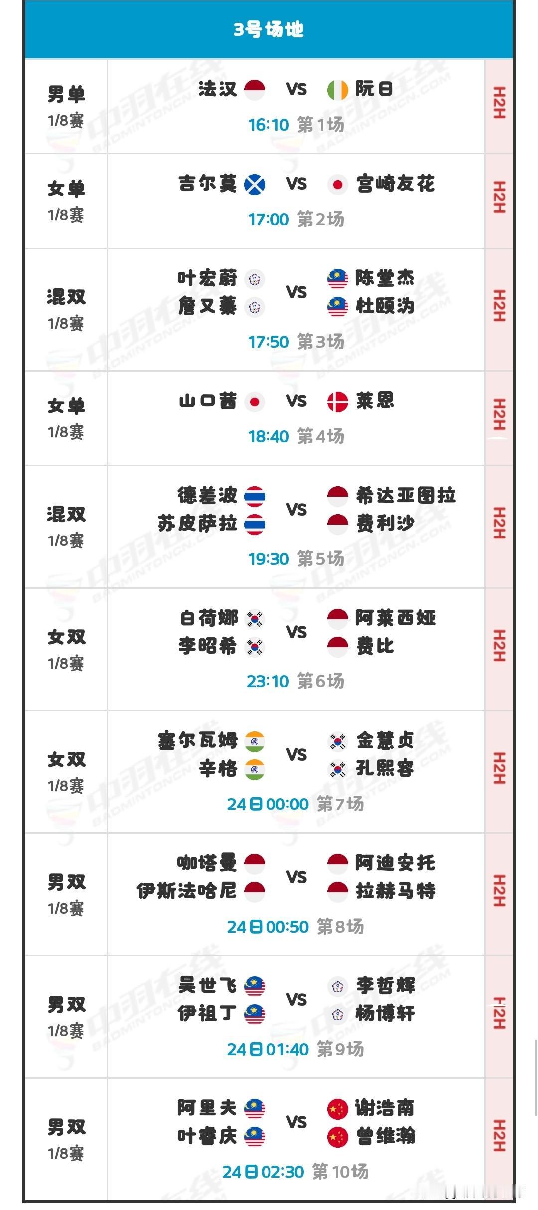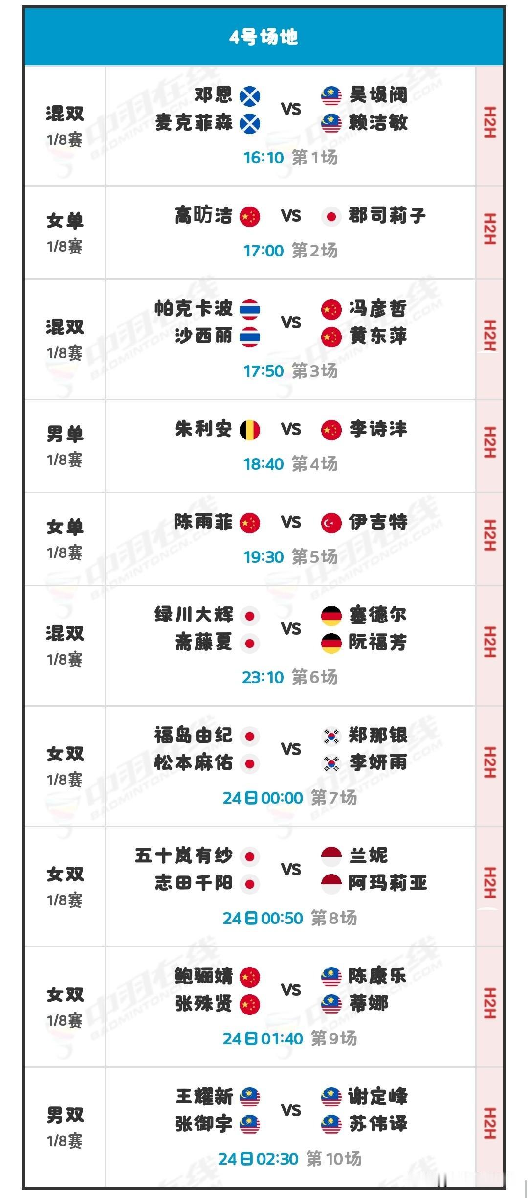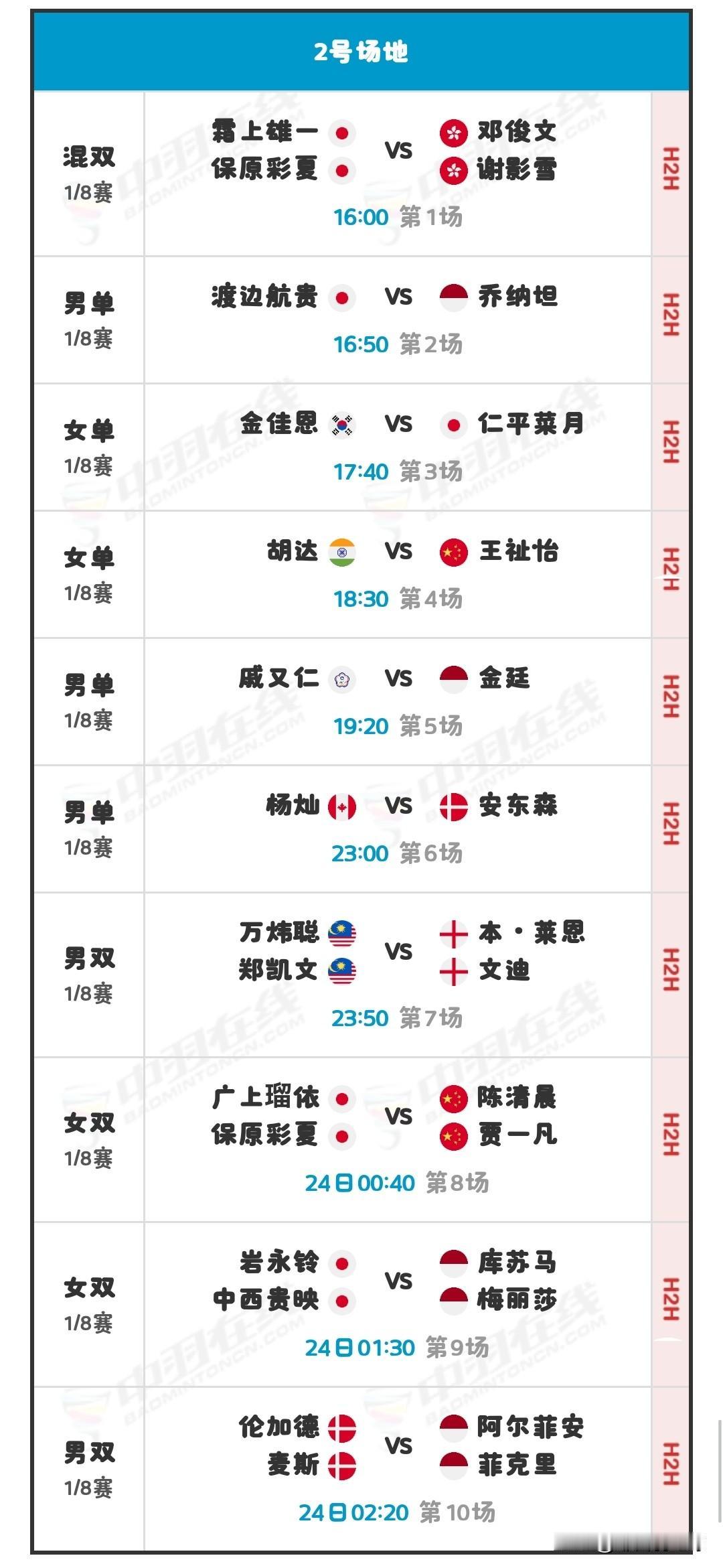 10月23日法国羽毛球公开赛1/8决赛安排 国羽昨天9胜5负,黄荻/刘阳对阵阿尔菲安/菲克里在先输一局时,选择退赛;陆光祖内战中途退赛;翁泓阳开局大比分落后,也选择了退赛;梁王组合连丢两局不敌队友浩瀚组合;高家炫/吴梦莹也是两局被队友凤凰组合带走,他们均止步首轮,惨遭一轮游。 经过两天激烈的比赛,首轮1/16决赛已全部结束,国羽总共取得了11胜7负的战绩。 今天1/8决赛北京时间16:00和23:00两个时段开始,共有四块场地同时进行,李诗沣vs朱利安,陈雨菲对阵伊吉特,周天成vs安赛龙,凡尘组合战日本,详细对阵安排如下: 国羽赛程 羽毛球 羽毛球爱好者 羽毛球比赛 国羽 国羽加油 李诗沣 陈雨菲