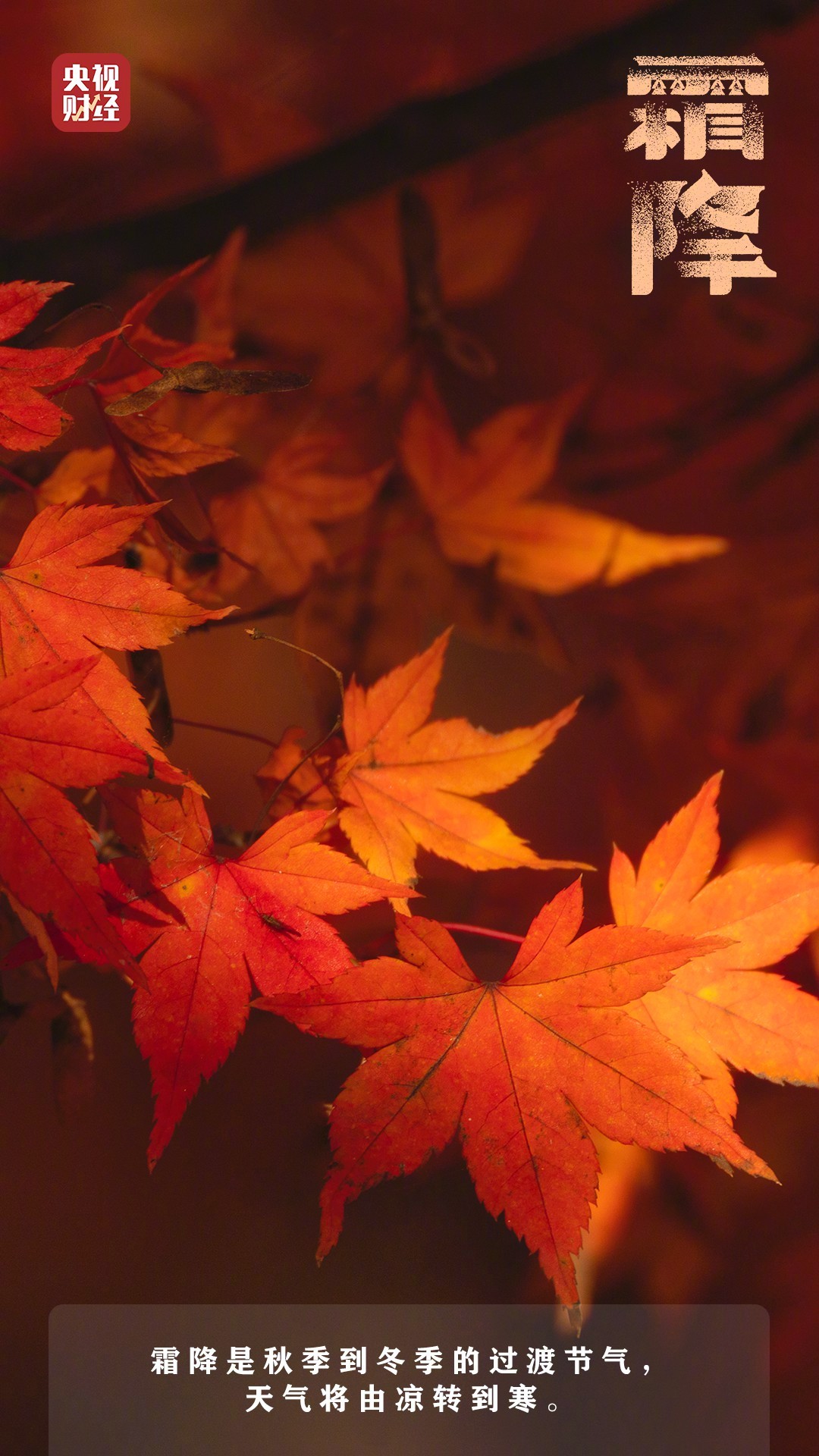 [转起迎接!#霜降是秋天最后的仪式感##霜降柿柿如意#]今天,#霜降#至。“气肃而凝,露结为霜”,霜降是秋季最后一个节气,是秋向冬过渡的开始。此时节,秋色斑斓,万山红遍,层林尽染。“寒露不算冷,霜降变了天。”经过霜打的柿子清甜可口,适当吃一些能补筋骨,抵御寒气。霜降过后,气温变化大,在享受秋色的同时,也要注意添衣保暖。转给你关心的TA~