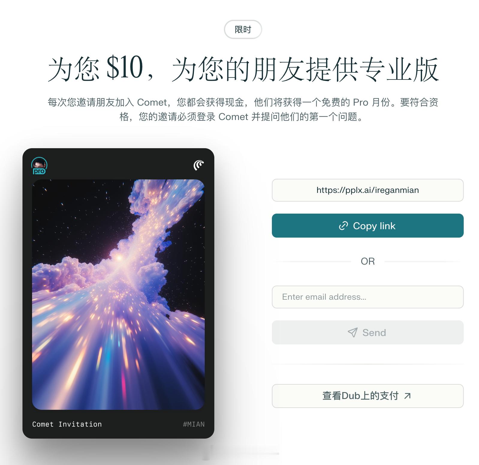 苹果公司潜在的收购对象 Perplexity AI 送钱了!下载安装使用它的 AI 浏览器 Comet 送一个月 Pro 会员,拉新一个送 10 美刀。不仅可以白嫖 Perplexity AI 会员,还可以改善生活。