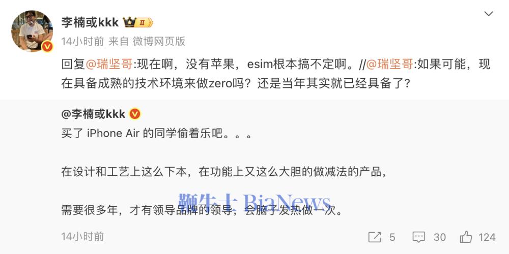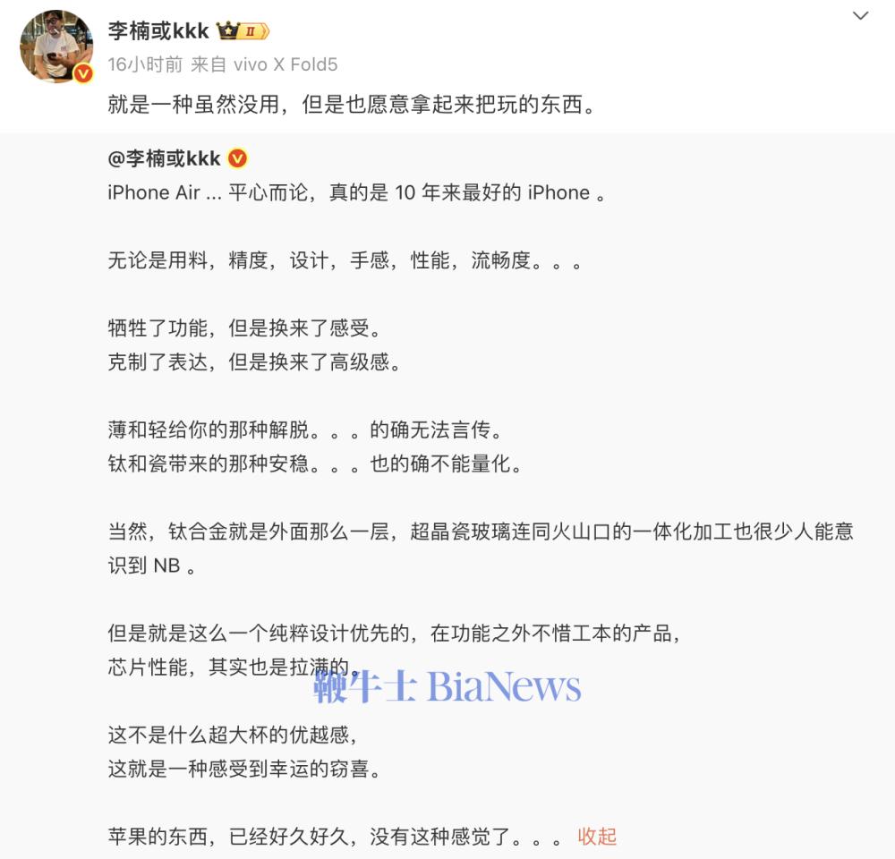 此外,李楠还曾点评iPhone为“虽然没用,但是也愿意拿起来把玩的东西”。李楠直言道,iPhoneAir平心而论,是10年来最好的iPhone。苹果的东西,已经好久好久,没有这种感觉了。