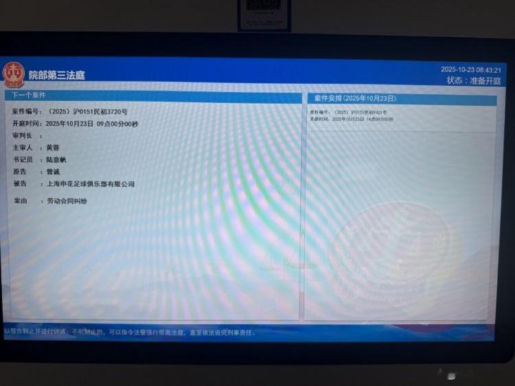 张冰在社媒晒出了本次开庭的相关信息,原告为曾诚,被告为上海申花足球俱乐部,案由为劳动合同纠纷。