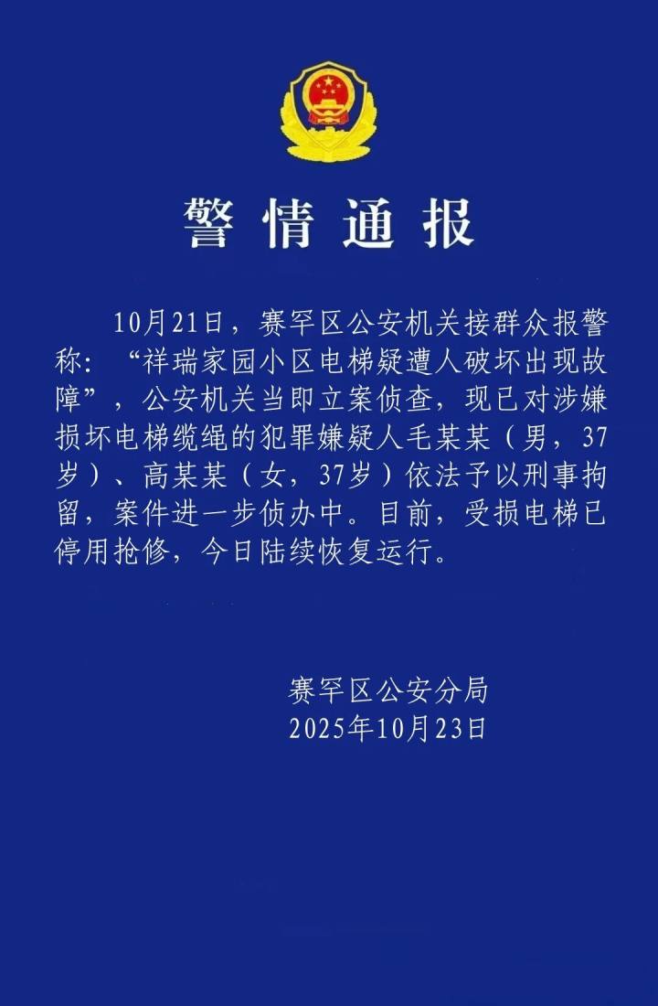 10月21日,赛罕区公安机关接群众报警称:“祥瑞家园小区电梯疑遭人破坏出现故障”,公安机关当即立案侦查,现已对涉嫌损坏电梯缆绳的犯罪嫌疑人毛某某(男,37岁)、高某某(女,37岁)依法予以刑事拘留,案件进一步侦办中。目前,受损电梯已停用抢修,今日陆续恢复运行。
