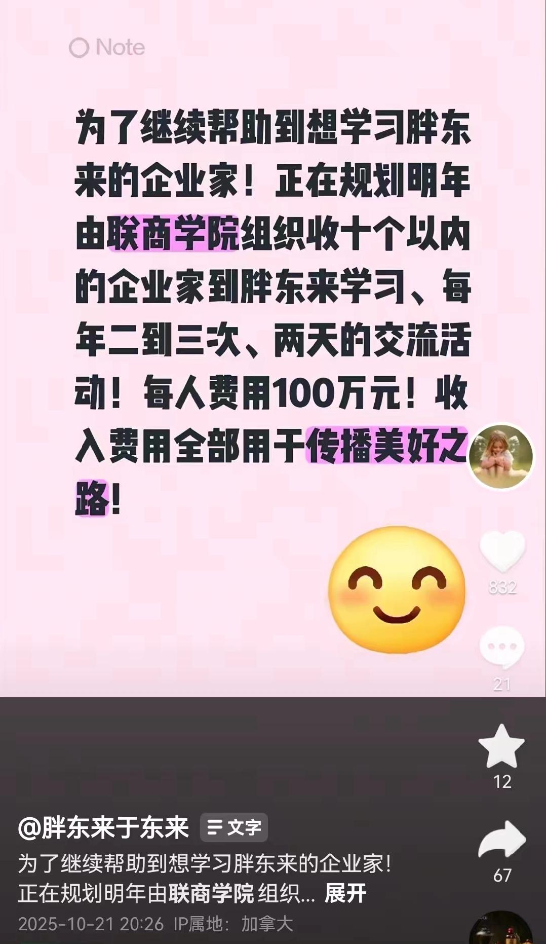 连续三天的发文,是面对纷扰的无奈,还是又一种营销手段? 10月20日,胖东来官方发布了一则企业开放日的公告(详见下图),大意是胖东来将每月的10日和20日为企业开放日,只针对单位,每人收费20000元;21日再次发文,是针对想要到胖东来学习的企业家的,胖东来将联合商学院,将用两天时间在胖东来学习和交流,每人收费100万元;22日于东来在平台发文,对想与于东来本人直接进行交流的企业家,每月安排一次,每次交流3个小时,收费50万元。 看到这三天胖东来连续针对到胖东来参观学习的发文,一些网民认为于东来这是把自己当作股神巴菲特,要学巴菲特的付费晚餐了;也有一些网民认为,这是面对每天络绎不绝到胖东来参观学习,给胖东来带来的烦扰,而采取的无奈之举;还有一种说法,这是胖东来的一种营销手段而已。 我更倾向于第二种说法,就是为了避免外界来胖东来参观学习的人太多,而给胖东来的正常经营带来的烦恼和困扰。你真心想学习胖东来,你就付费好了,而对那些想蹭热点的趋炎附势者,这多了一道门槛。 之所以这样说,就是因为胖东来在前段时间对一些知名商超的无偿指导调改,甚至不惜牺牲自己的利益也在帮扶其他企业。这充分说明,此次胖东来的收费,并不是为了这几个钱,而就是为了避免外界对胖东来正常经营的干扰!