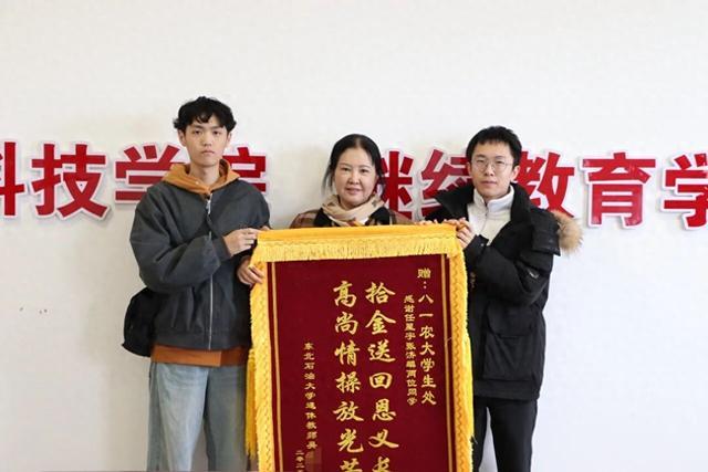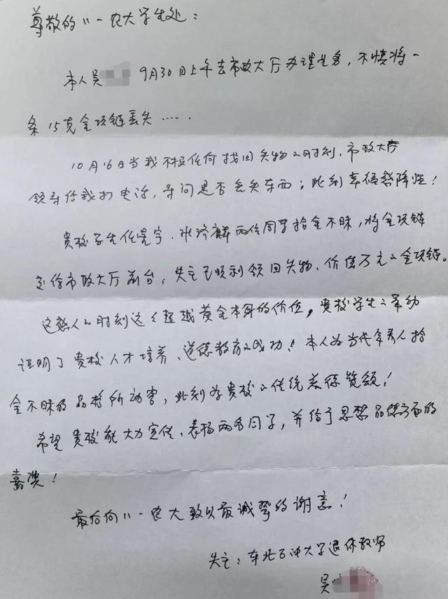 吴女士介绍,她是东北石油大学的退休教师,这条重15克的金项链对她具有非凡意义,已陪伴她走过四十余载岁月,承载着她和丈夫深厚的情感记忆,对她而言是无价之宝。她同时感激黑龙江八一农垦大学应用科技学院(继续教育学院)对任星宇、张济麟两名同学的悉心培养。